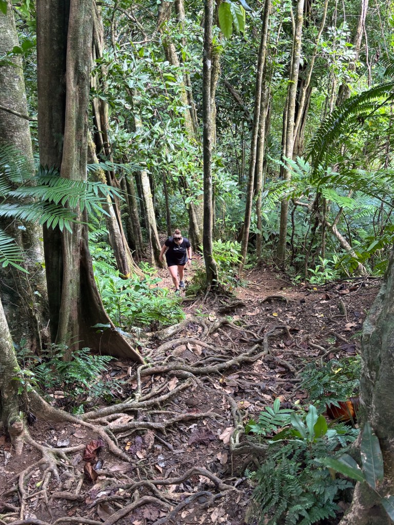 Vom Hostel aus fuhren wir mit dem Bus zum Startpunkt an der Hauptstrasse. Zu Fuss ging es zunächst entlang einer Strasse bis zum Dschungelrand, wo der eigentliche Aufstieg begann. Über Wurzeln und umgestürzte Bäume stiegen wir stetig bergauf, insgesamt etwa 700 Höhenmeter.