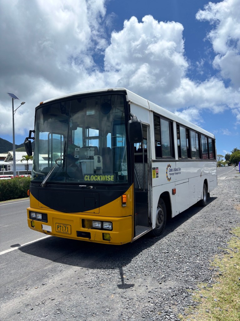 Auch die Weiterreise zu unserer ersten Unterkunft war unkompliziert. Auf der Hauptinsel Rarotonga gibt es zwei Busrouten: eine im und eine gegen den Uhrzeigersinn. Die komplette Runde dauert etwa eine Stunde, Haltestellen gibt es nicht. Stattdessen setzt man sich an den Strassenrand und macht sich bemerkbar, sobald der Bus in Sichtweite kommt.