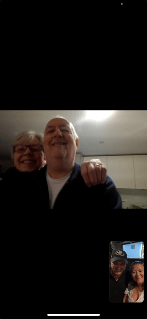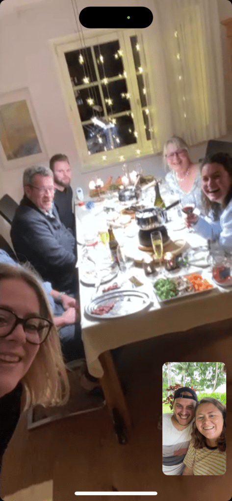 Am Weihnachtsmorgen konnten wir dann zuerst kurz dem Weihnachtsessen bei meiner Familie und danach bei Philippes Familie virtuell beitreten. Es war etwas chaotisch, mit mehreren Personen gleichzeitig zu reden – die schlechte Verbindung hat sicher nicht geholfen, auch nicht für das Foto– aber es war sehr schön, alle wieder einmal zu sehen und sich trotzdem ein bisschen dazugehörig zu fühlen. Am Abend kam dann noch das Telefonat mit meinem Papi und Luzia dazu. Somit haben wir unsere ganzen Familien gesprochen und sind glücklich, so tolle Menschen in unserem Leben zu haben.