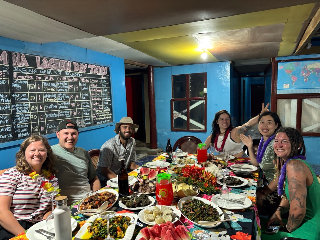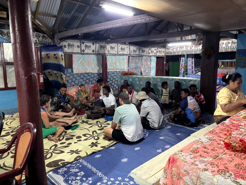 Die gleichen Speisen gab es auch für alle Einheimischen am Buffet. Wir kamen uns doch etwas komisch vor, so speziell behandelt zu werden. Das hat sich dann aber nach dem Essen bei der Kava-Zeremonie schnell gelegt. Kava darf natürlich bei einer Weihnachtsfeier nicht fehlen. Falls ihr nicht wisst, was Kava eigentlich ist, könnt ihr dies gerne in unserem Fidschi-Beitrag nachlesen. Wir hätten doch etwas mehr Partystimmung erwartet, mit Musik und Tanzen, aber irgendwie scheint das hier nicht so ein Ding zu sein. Die Party besteht daraus, am Boden in einem Kreis zu sitzen und Kava zu trinken. Musik gibt es nur etwas im Hintergrund, und kaum jemand redet dabei.