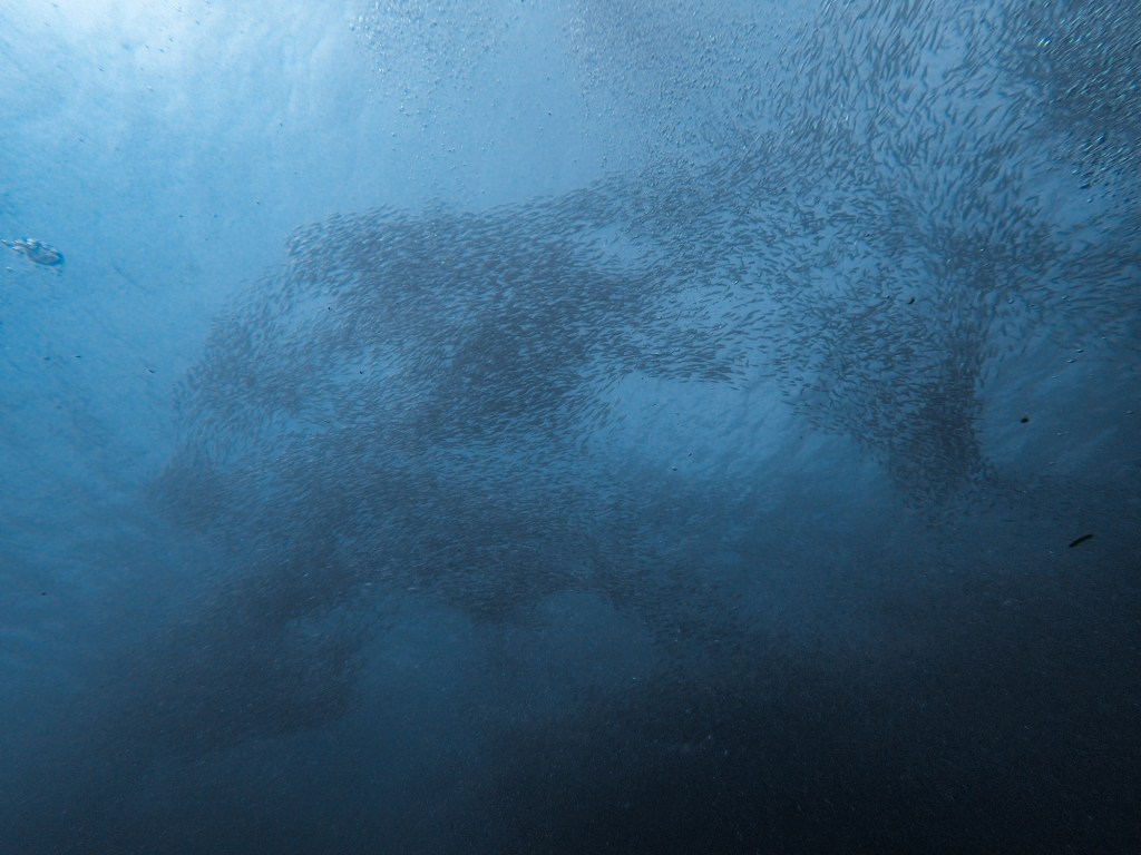 Es war sehr eindrücklich, diese riesige Sardinenwand vor sich zu sehen. Teilweise wurde es einfach ganz dunkel, weil die Sardinen über uns waren. Die Tauchlehrer haben aber darauf geachtet, dass wir nicht in die Schwärme hineinschwimmen, sodass wir sie immer etwas aus der Ferne beobachtet haben. Für die Erfahrung war das sicherlich etwas schade, grundsätzlich finde ich es aber gut, dass die Tiere nicht auch noch von den Tauchern gestört werden. Es gibt unzählige Schnorchler an diesem Spot, die alle ständig in die Schwärme hineinschwimmen, um das perfekte Foto zu machen.
