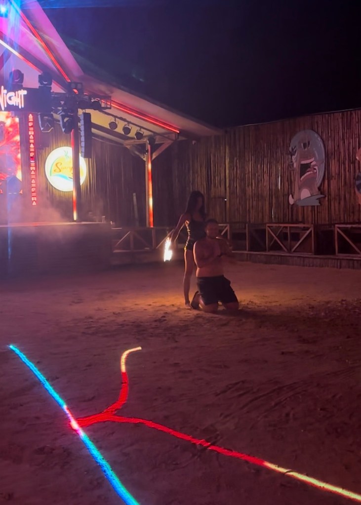 Irgendwie wurde der Beachclub zu unserem täglichen Besuch, jeweils immer nur kurz zum schauen, ob viel los ist. An einem Abend wurde unsere Interesse geweckt von einer Feuershow mit einem tollen Hauptdarsteller – Philippe. Er wurde von einer Tänzerin nach vorne geholt und für die Feuershow eingesetzt. Er fand es nicht so toll, wir aber umso lustiger.