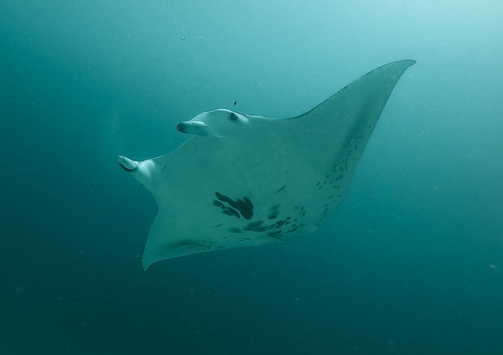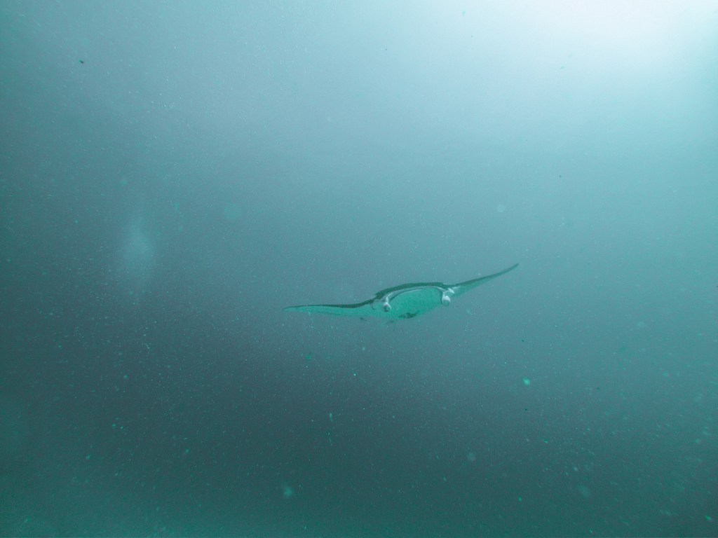 Es gibt zwei Arten von Mantas – in Raja Ampat kann die grössere Form, die Riesenmantas, bestaunt werden. Mit einer Spannweite von bis zu acht Metern (laut unseren Tauchguides) haben sie sich diesen Namen definitiv verdient. Wenn ein solches Tier über einen hinwegschwimmt, wird es unter Wasser plötzlich ziemlich dunkel. Sie lieben die Luftblasen, die Taucher unter Wasser verursachen und schwimmen deshalb immer wieder um einen herum – ein wirklich beeindruckendes Erlebnis.