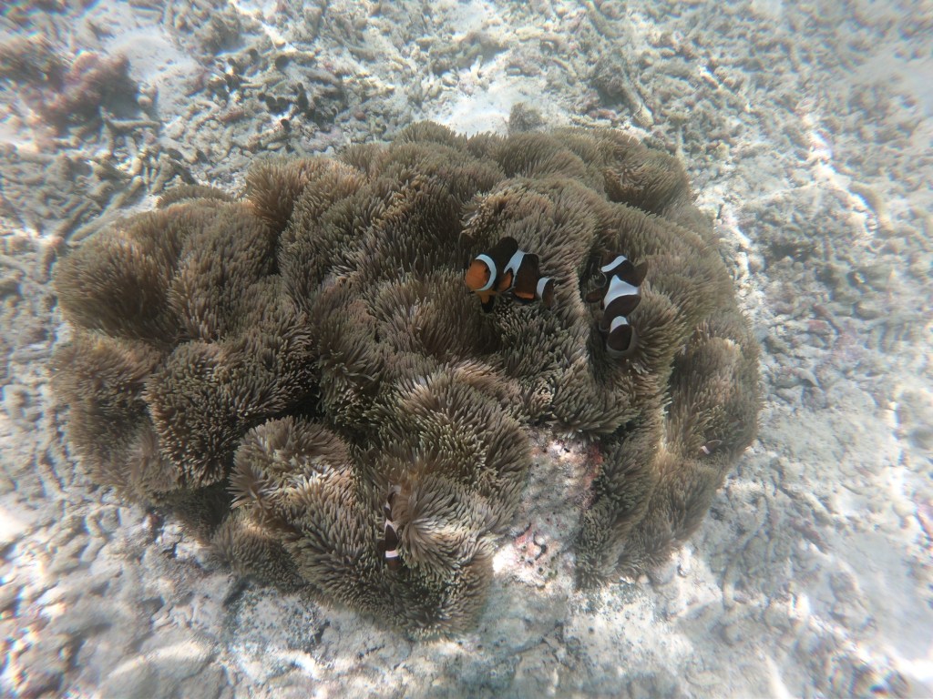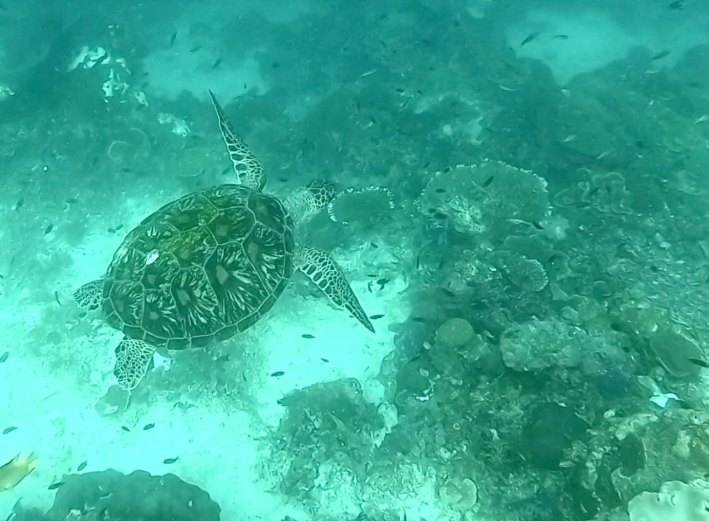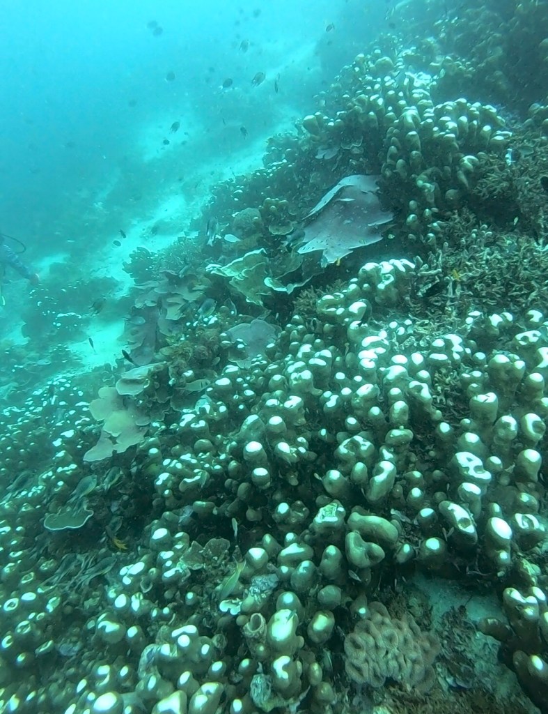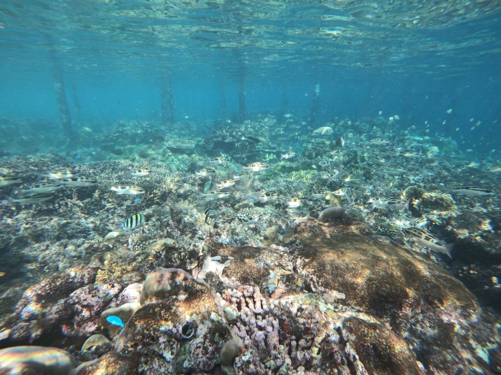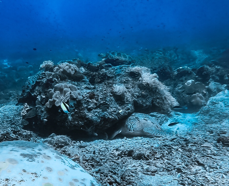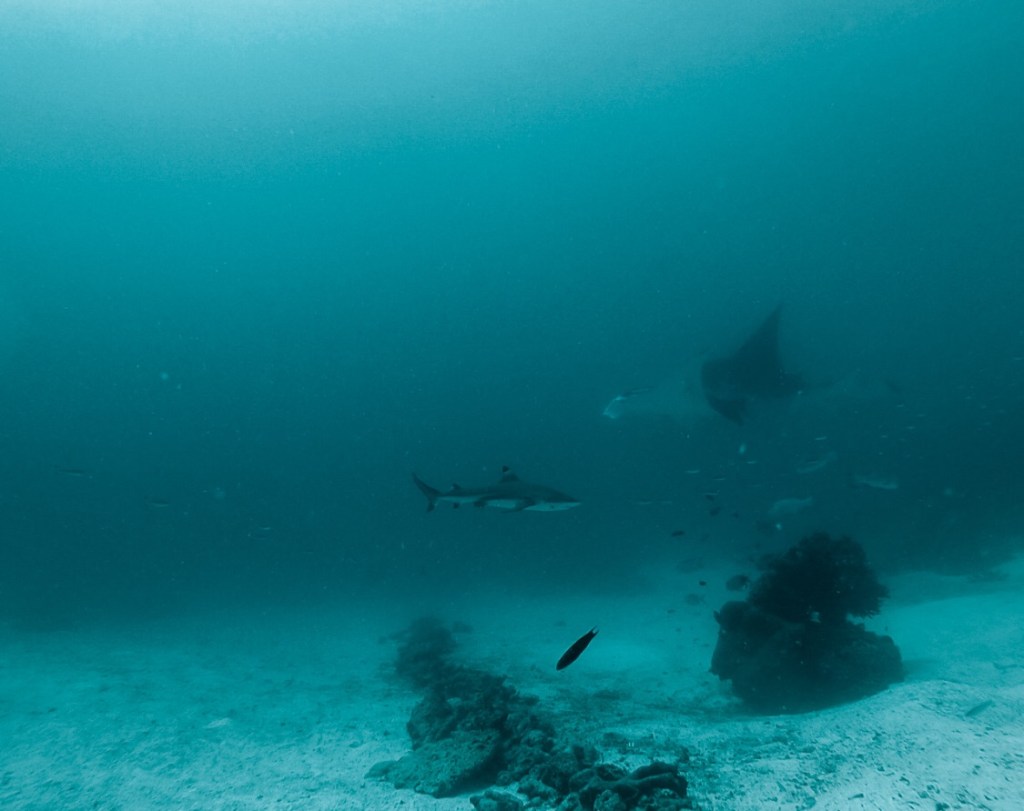 Natürlich haben wir nicht nur Mantas gesehen. Während unserer Tauchgänge begegneten uns häufig Schwarzspitzen-Riffhaie oder Schildkröten, ausserdem zwei Teppichhaie, ein Krokodilfisch, Napoleonfische, Seepferdchen, Barrakudas und unzählige Fischschwärme, die wir nicht näher bestimmen konnten. Leider haben wir nur eine uralte GoPro-Kamera, die zwar Bilder macht, aber die Farben der Unterwasserwelt nicht annähernd so einfangen kann, wie sie in der Realität sind. Die Bilder geben aber trotzdem einen guten Eindruck davon, wie es war.