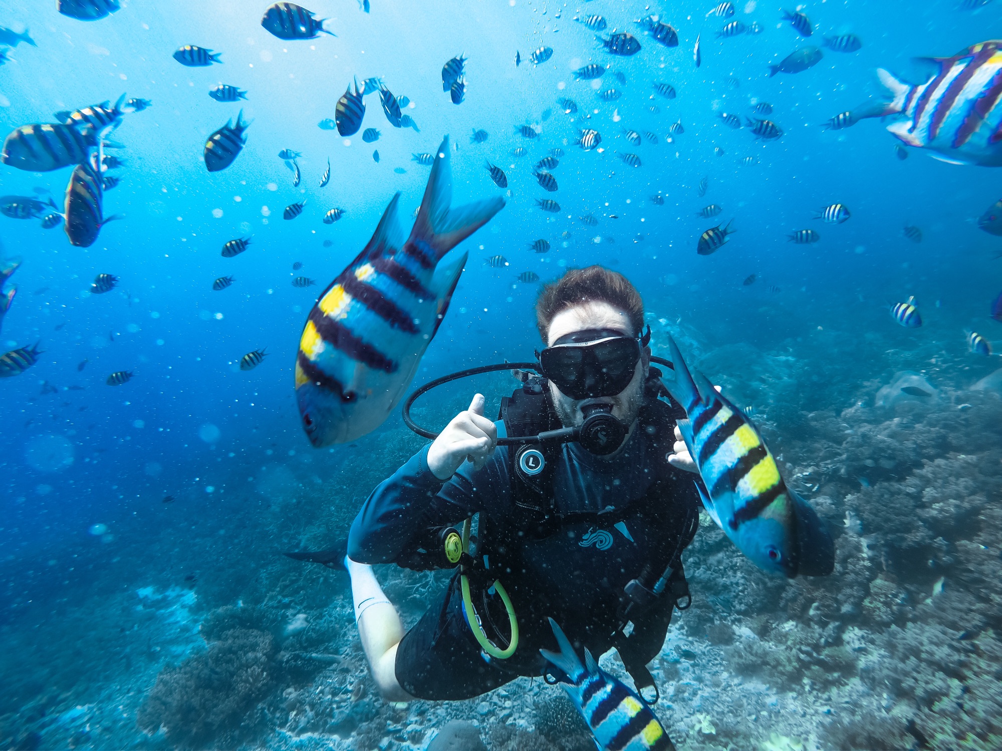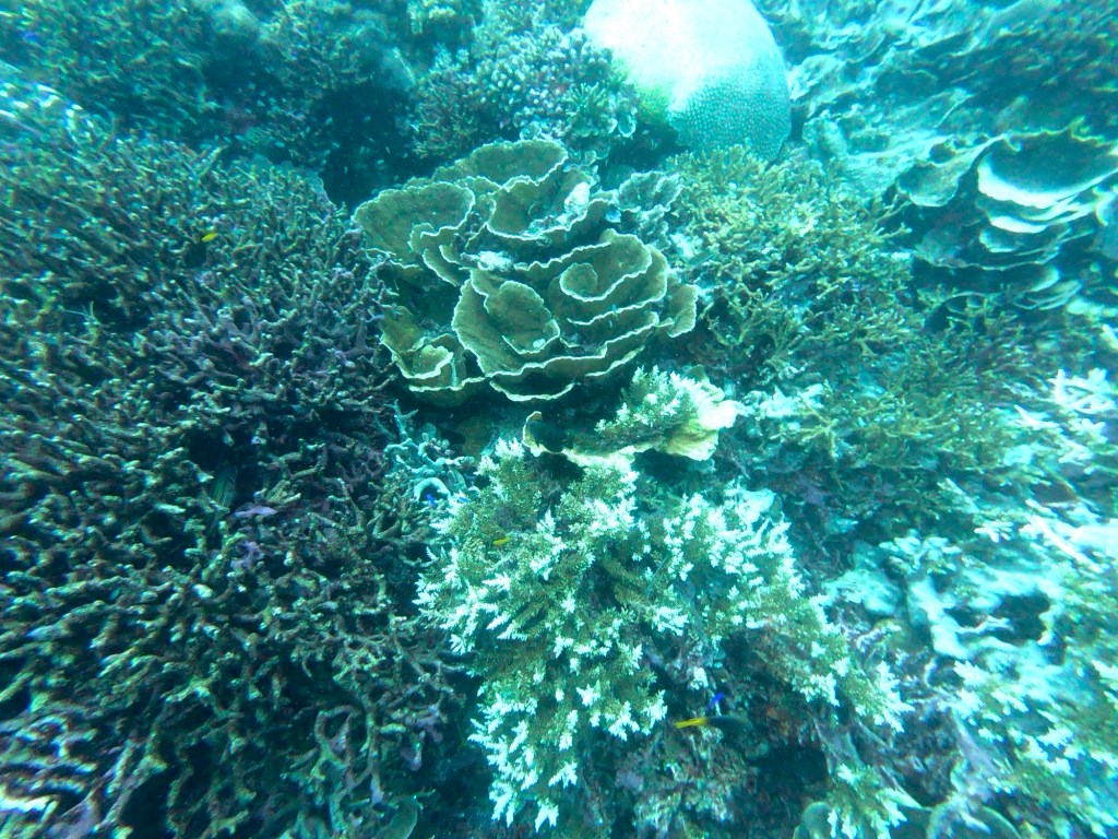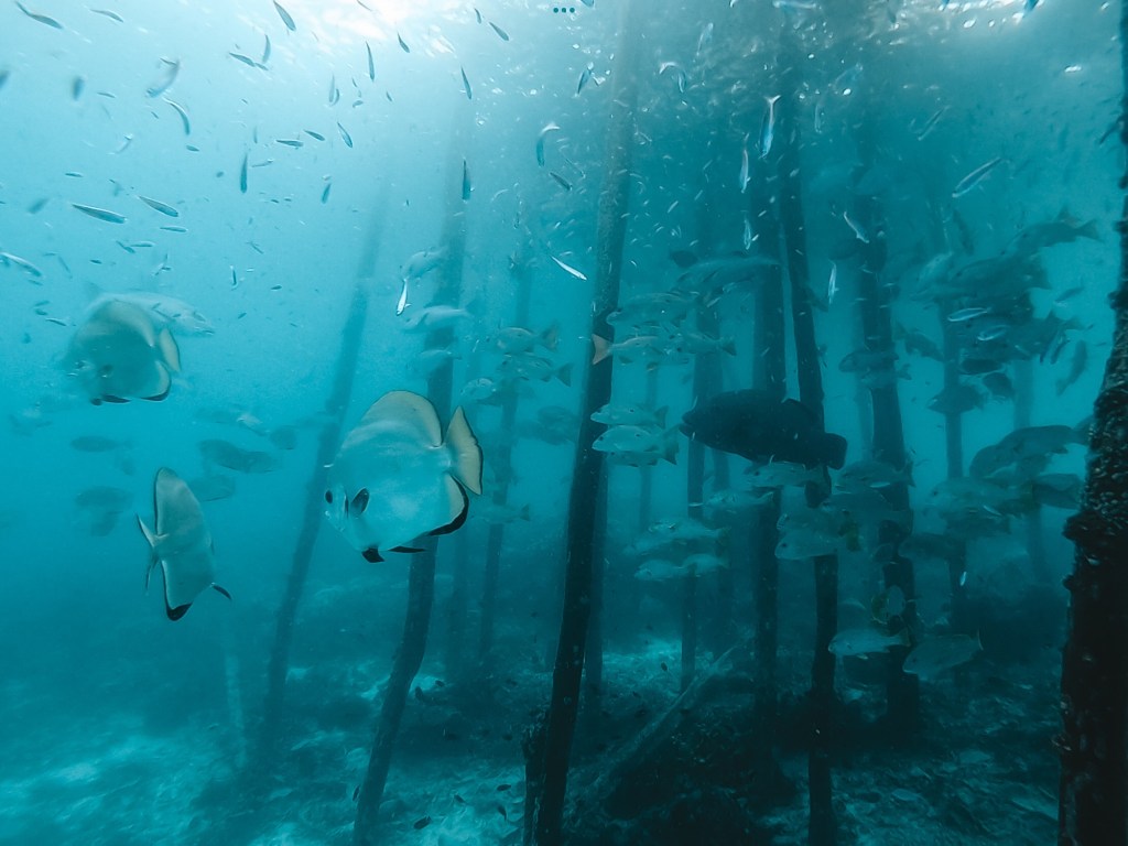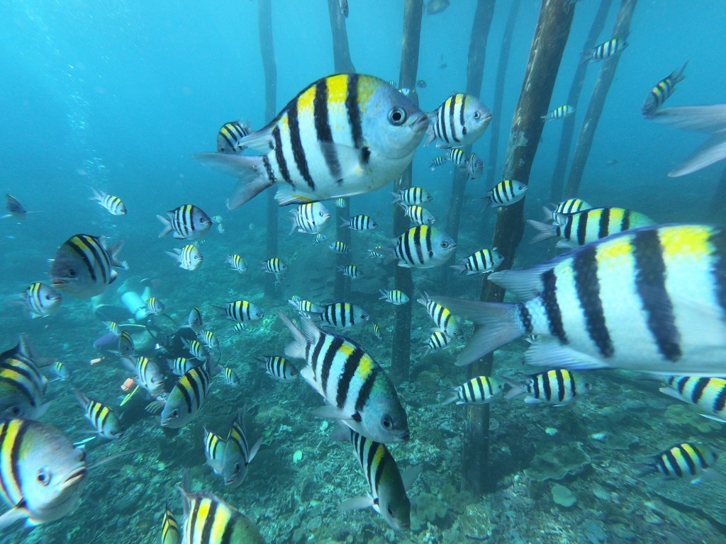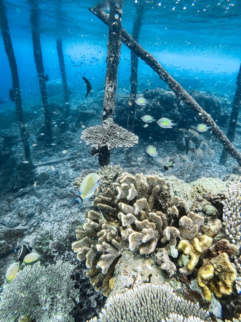 Natürlich haben wir nicht nur Mantas gesehen. Während unserer Tauchgänge begegneten uns häufig Schwarzspitzen-Riffhaie oder Schildkröten, ausserdem zwei Teppichhaie, ein Krokodilfisch, Napoleonfische, Seepferdchen, Barrakudas und unzählige Fischschwärme, die wir nicht näher bestimmen konnten. Leider haben wir nur eine uralte GoPro-Kamera, die zwar Bilder macht, aber die Farben der Unterwasserwelt nicht annähernd so einfangen kann, wie sie in der Realität sind. Die Bilder geben aber trotzdem einen guten Eindruck davon, wie es war.