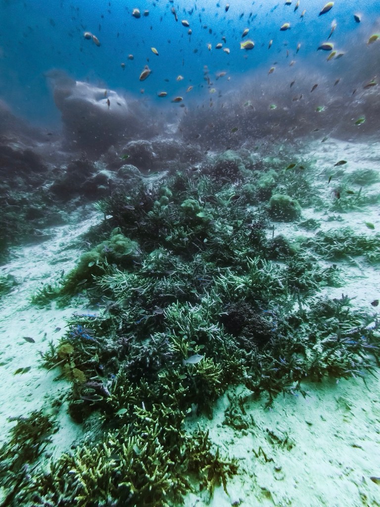 Leider gibt es immer auch eine Schattenseite – so auch in Raja Ampat. Die Problematik der Klimaerwärmung und der damit verbundenen Korallenbleiche macht auch vor Raja Ampat nicht halt. Es ist zwar weniger stark betroffen als viele andere Orte, aber die Veränderung beginnt auch hier langsam. Einige Korallen waren bereits völlig verblasst, bei anderen war an den Spitzen sichtbar, dass der Prozess begonnen hat.