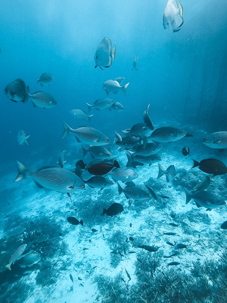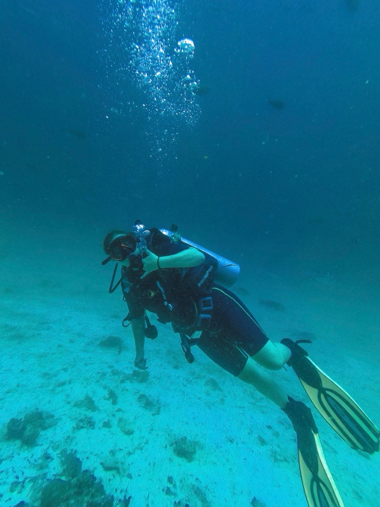 Während dieser Tauchgänge konnten wir viel Erfahrung sammeln. Wir konnten das Gewicht, das an einem Gurt befestigt wird, verringern und die Länge der Tauchgänge von 37 auf 58 Minuten steigern. Auch waren wir deutlich entspannter beim Tauchen, konnten alle Eindrücke in Ruhe aufnehmen und geniessen und sogar ein wenig herumalbern unter Wasser, so zum Beispiel versuchen Ringe aus Luftblasen zu formen.