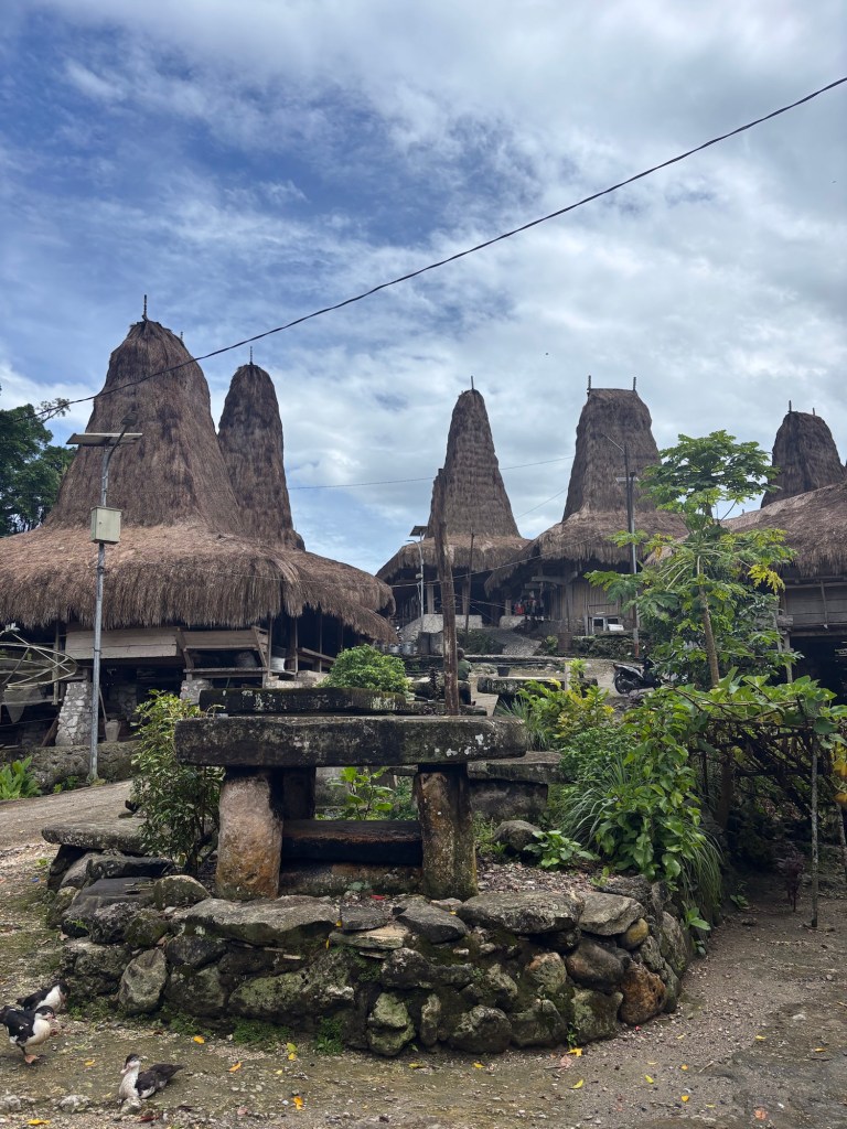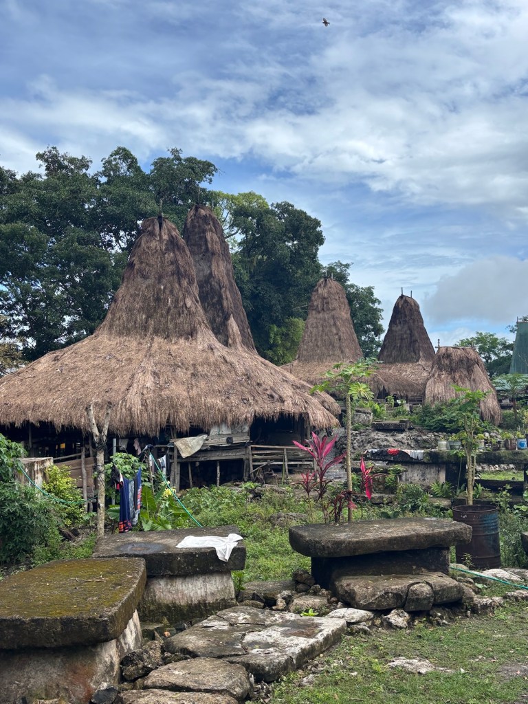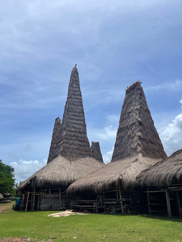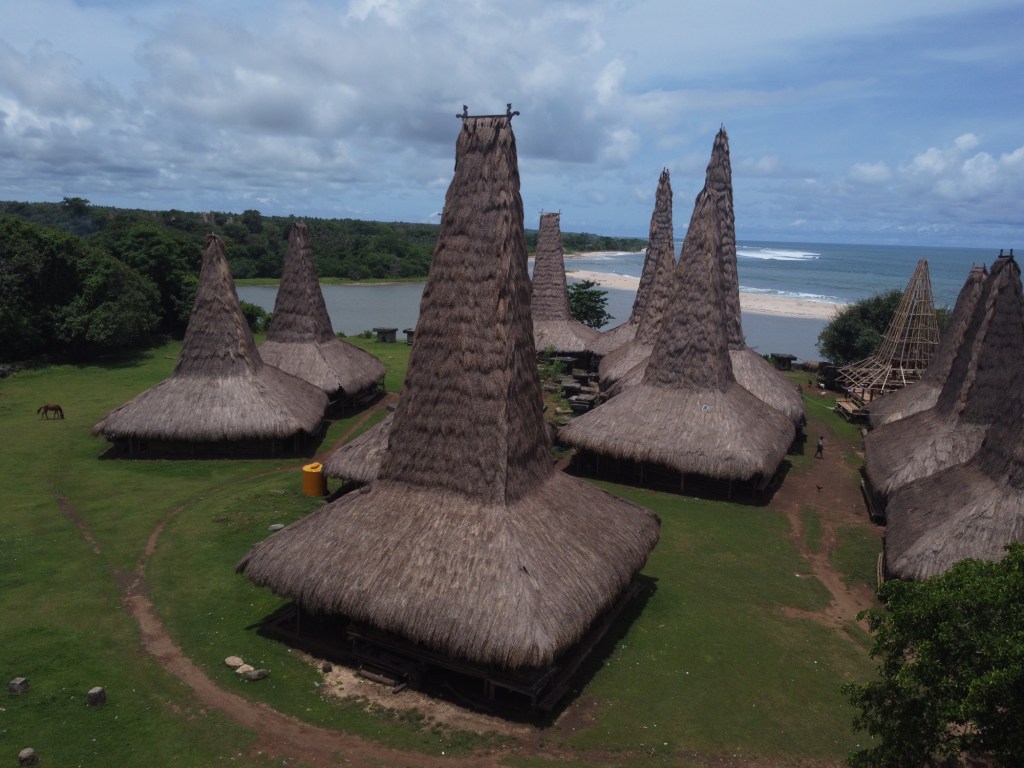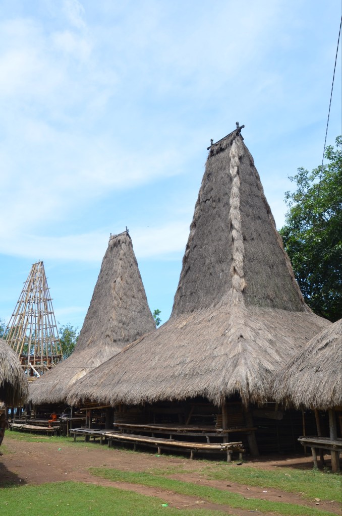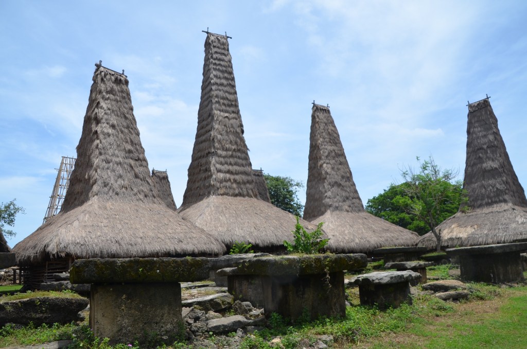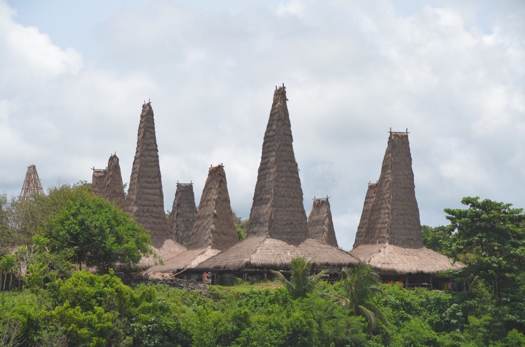 Ein sumbanesisches Haus zeichnet sich durch einen hohen, zentralen Gipfel auf dem Dach aus, welcher die Verbindung zwischen der realen und der spirituellen Welt darstellt.