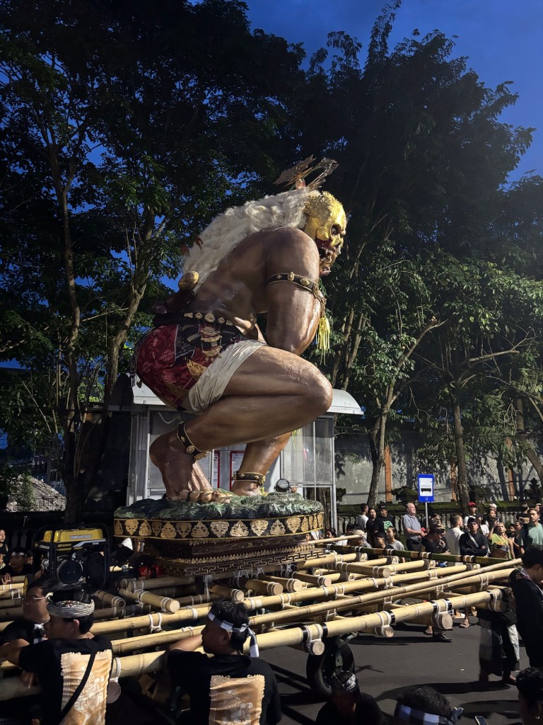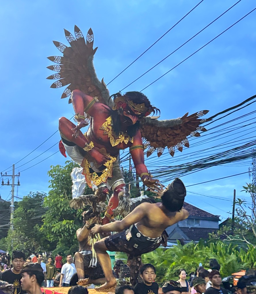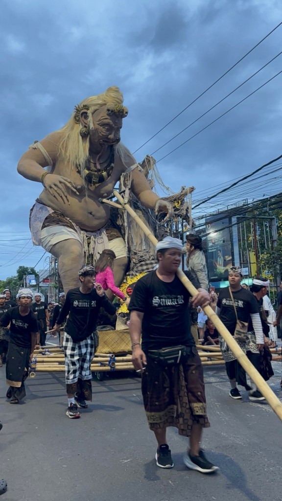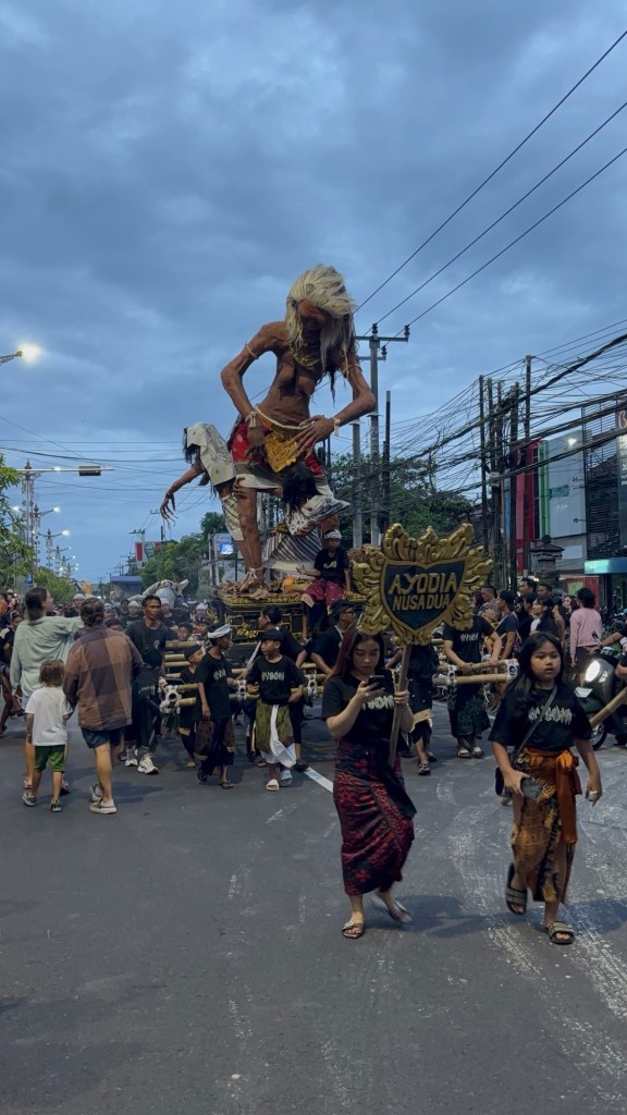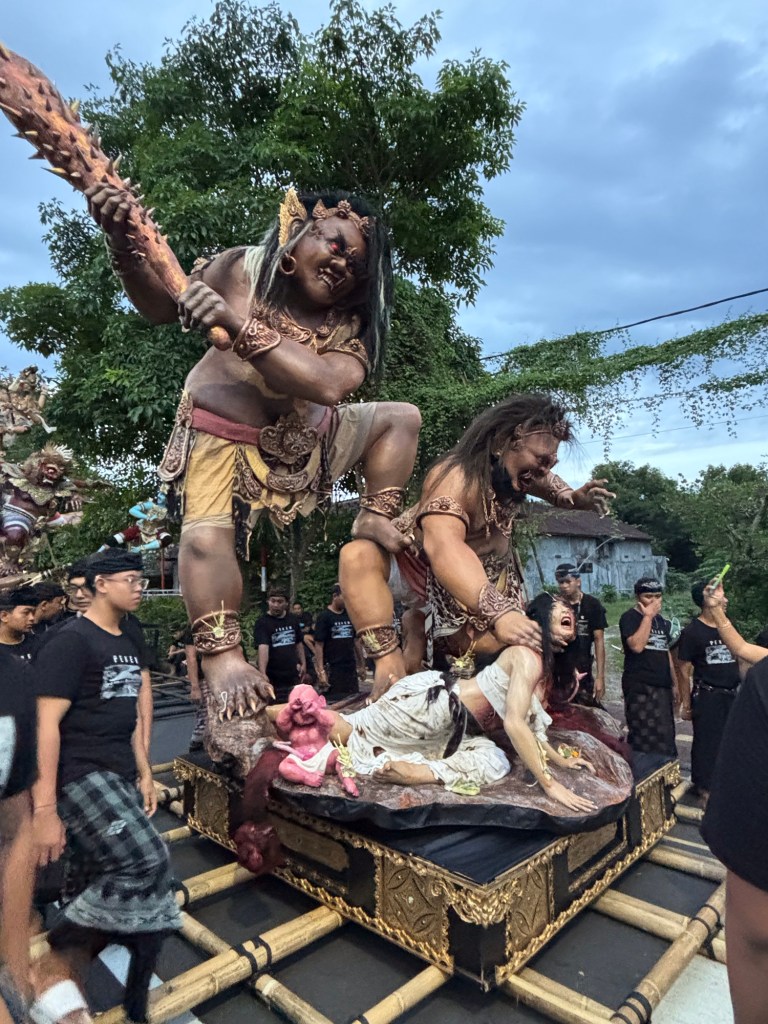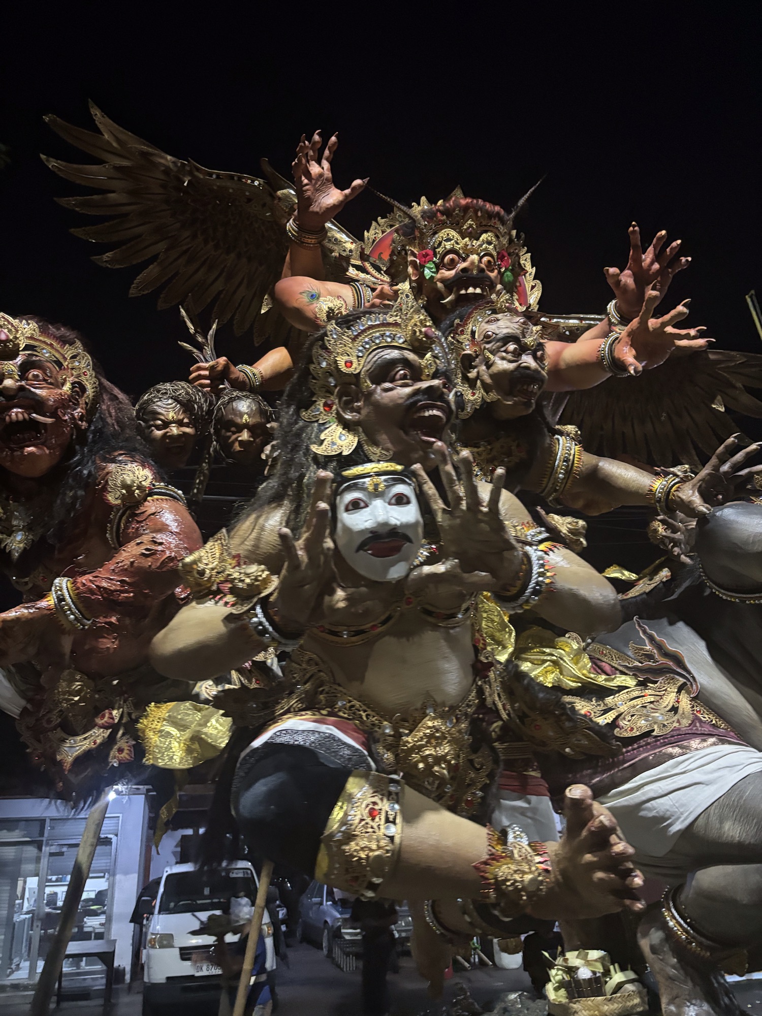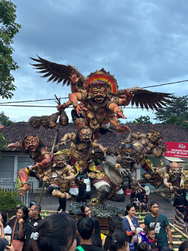 Am Abend vor Nyepi finden überall auf der Insel in den Dörfern Paraden mit Ogoh-Ogohs (auf Indonesisch auch „Ogoh2“) statt. Diese riesigen Skulpturen werden über Monate hinweg gebaut und stellen Dämonen dar, die die Insel heimsuchen. Während der Parade werden die Ogoh2 durch die Strassen getragen, es wird traditionelle Musik gespielt – teilweise werden sie am Ende verbrannt. Gewisse Ogoh2 waren zwar etwas verstörend, aber sehr beeindruckend gebaut.