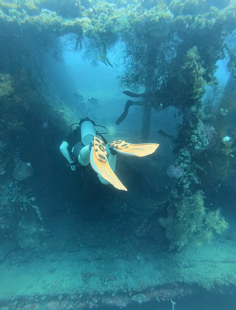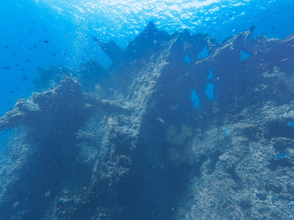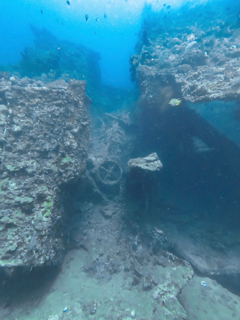 Nach der Nacht in Gretek ging es weiter bis nach Amed, das letzte Ziel unserer Rundreise. Amed ist ein kleiner Küstenort, welcher bekannt fürs Tauchen ist. Auch für Amed hatten wir zwei Tauchgänge eingeplant. Amed ist für einen Tauchplatz vor allem sehr berühmt, welcher tatsächlich gar nicht wirklich in Amed liegt, sondern etwa 20 Minuten entfernt in Tulamben. Das USAT Liberty-Schiff wurde im Zweiten Weltkrieg vor der Küste Balis getroffen und strandete durch zu viel Wasser im Schiffsbauch am Strand von Tulamben. Durch ein Erdbeben 1963, welches zu einem Ausbruch des Vulkan Agung führte, wurde das Schiff ins Meer gedrückt und ist am tiefsten Punkt bis auf 40 Meter gesunken. Dieses Schiffswrack ist mittlerweile von Korallen bedeckt und kann nun beim Schnorcheln oder Tauchen bestaunt werden. Ich habe 2016 genau bei diesem Schiffswrack meinen Tauchschein gemacht, Philippe wollte es aber natürlich selber auch sehen und somit haben wir dort unseren ersten Tauchgang gemacht. Es ist schon ein eindrucksvoller Tauchspot. Das Steuerrad ist noch gut sichtbar und es gibt Stellen, bei denen wir rein- und durchtauchen konnten.