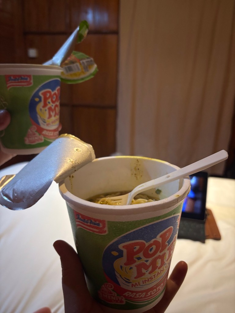 An diesem Tag war ein sehr wichtiger hinduistischer Feiertag auf Bali, Galungan, und es fanden viele Zeremonien statt. Warungs (kleine lokale Restaurants) waren alle geschlossen, so auch das der Unterkunft. Zum Glück gibt es Nudelsuppen im Supermarkt und meistens einen Teekocher in den Zimmern, sodass wir nicht verhungern mussten.