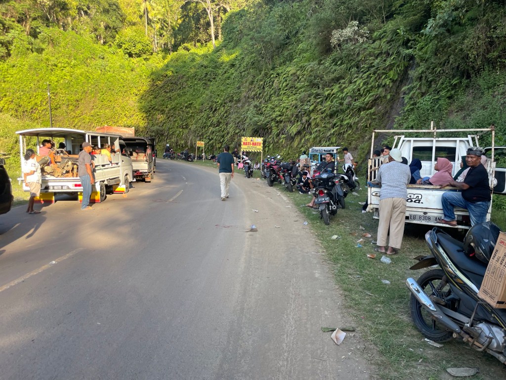Die Strecke von Ende nach Moni führt an steilen Abhängen vorbei, teils mit Erdrutschen. Auf zwei Abschnitten wurde gearbeitet. In Indonesien heisst das: Der Verkehr darf nur zur vollen Stunde durch. Wer kurz danach kommt, wartet eine Stunde – so auch wir. Die Leute machten es sich dort gemütlich, es gab Essen und Snacks – für sie völlig normal, für uns eher ungewohnt.