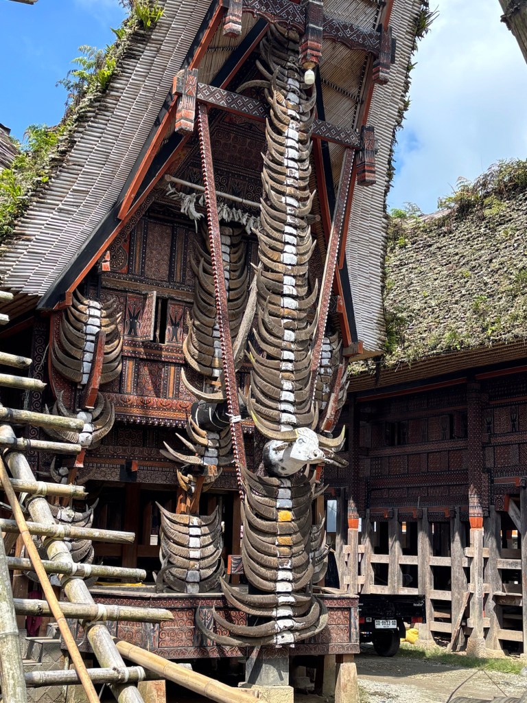 Diese Häuser haben ein Dach in Form eines Bootes, das wie auf einem Sockel sitzt – alles ist auf Stelzen gebaut. Die Bootsform symbolisiert die Ankunft der ersten Menschen dieser Kultur auf Sulawesi. Am Bug des Hauses befinden sich häufig Tierschädel: Ein weisser Schädel steht für den höchsten sozialen Rang, ein schwarzer für den Mittelstand, und wer keinen Schädel hat, gehört zur einfachen Bevölkerung.