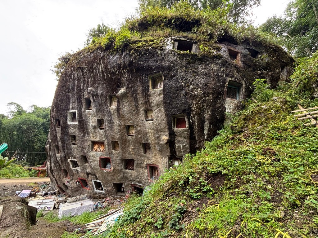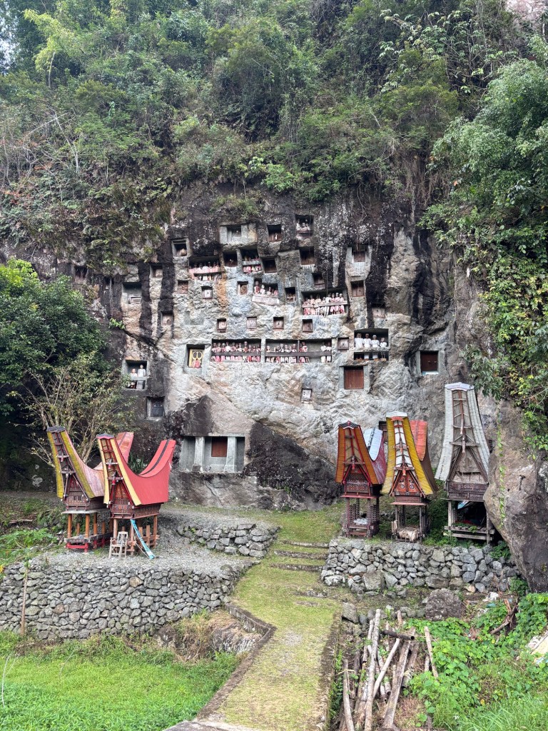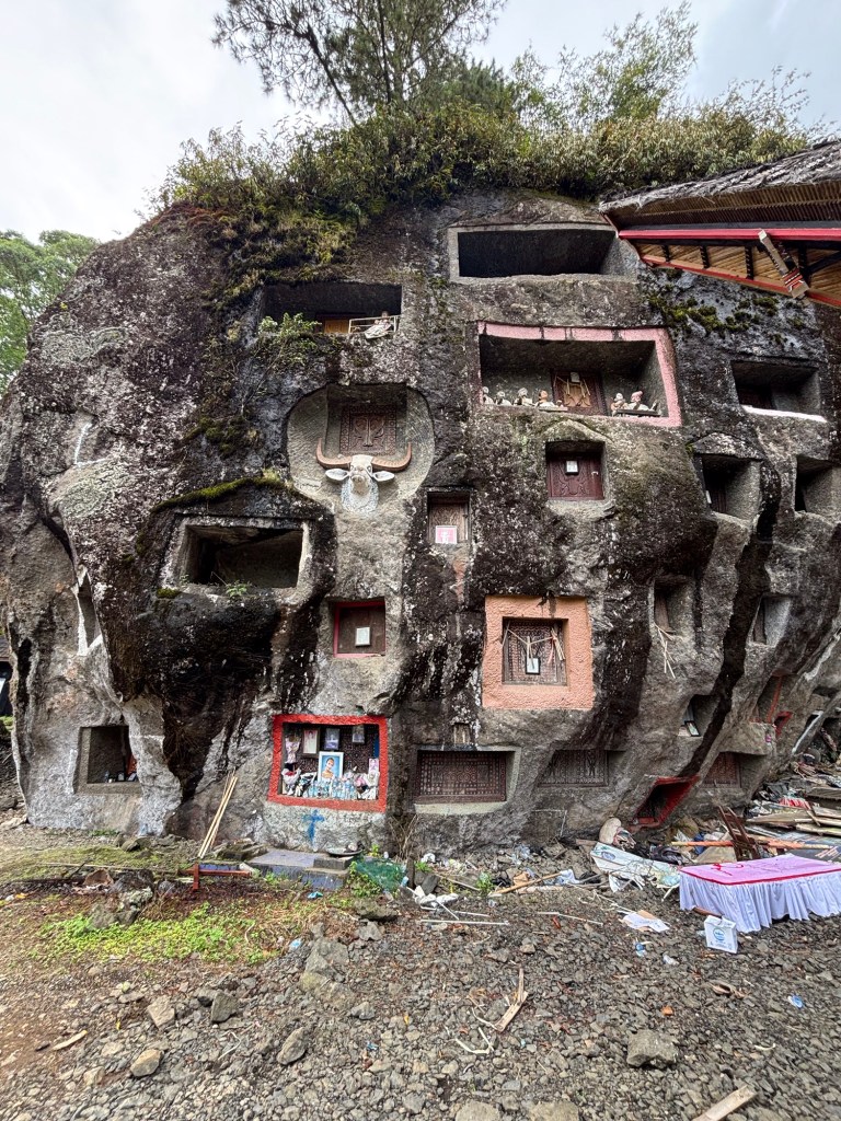 Nicht nur die Beerdigungszeremonie ist eine andere Herangehensweise als bei uns, auch die Gräber selbst. Diese befanden sich ursprünglich in Höhlen. Dabei wurden die Personen einfach in die Höhle gelegt, kein Sarg oder Ähnliches. Aus Platzgründen und weil es einfacher ist, wurden im Verlauf der Zeit die Gräber nur noch in den Felsen gehauen und nochmals später vor dem Felsen in kleinen traditionellen Häusern gemacht.