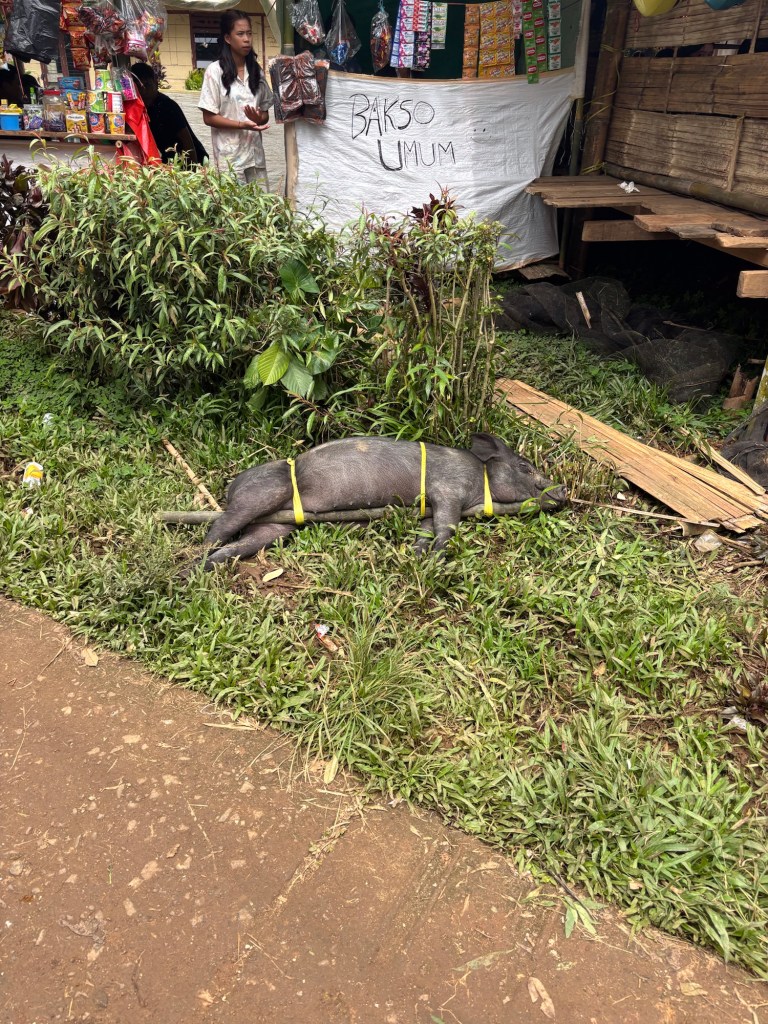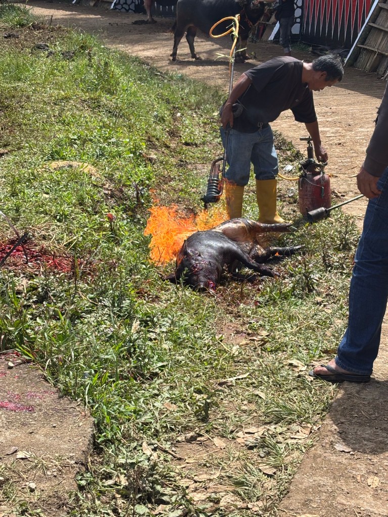 Philippe hat den ersten Tag einer Zeremonie besucht. Auch dort werden bereits Tiere geschlachtet, aber nur wenige für das Mittagessen. So hatte er bereits ein frisches Stück Büffel und Schwein auf seinem Teller, als direkt vor ihnen ein Schwein aufgeschlitzt wurde und das Blut nur so herumspritzte. Direkt danach sind sie mit einer Art Bunsenbrenner herangegangen, um das Fleisch gut verwerten zu können.