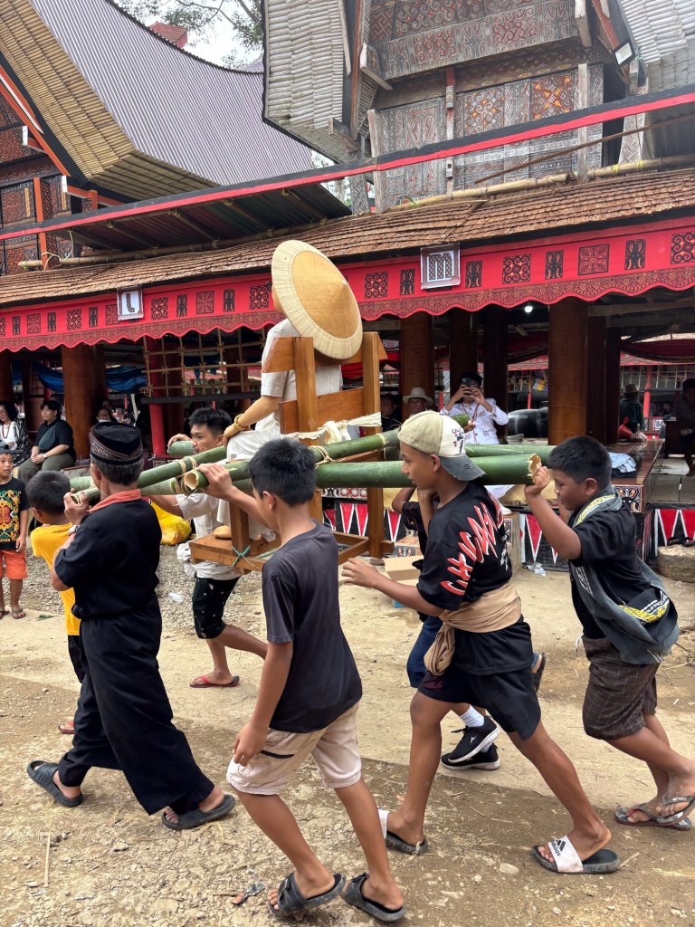 Beerdigungen finden nicht, wie wir es kennen, häufig zügig nach dem Tod statt. Es kann auch vorkommen, dass die verstorbene Person über Jahre noch im gleichen Haus mit der Familie ist. Dabei werden die Verstorbenen, wie es aus dem alten Ägypten bekannt ist, mumifiziert und „haltbar“ gemacht. In der Toraja-Kultur gilt eine Person erst als tot, wenn sie begraben wurde. So kann die Familie ihre verstorbenen Mitmenschen bei sich im Wohnzimmer haben. Sie erzählen dieser Person von ihrem Alltag und beziehen sie weiter mit ins Familienleben ein. Diese Personen sind dabei nicht verpackt in einem Sarg oder Ähnlichem, sondern werden mit einem Stock als Rückgrat aufrecht gehalten und stehen so im Raum.