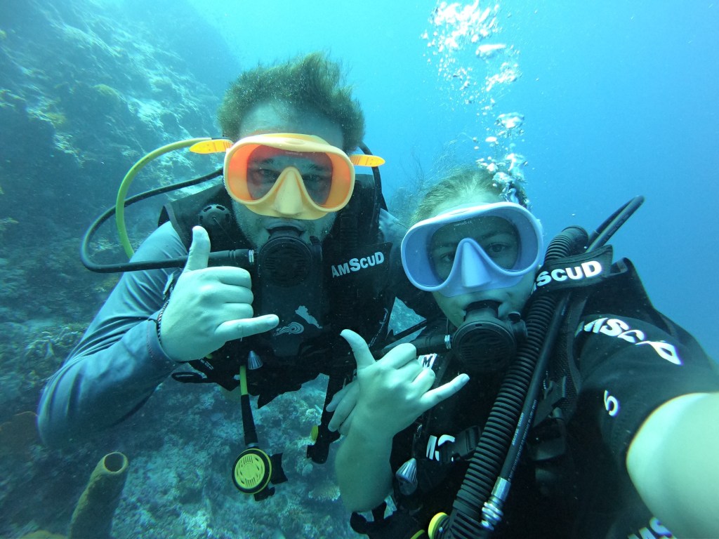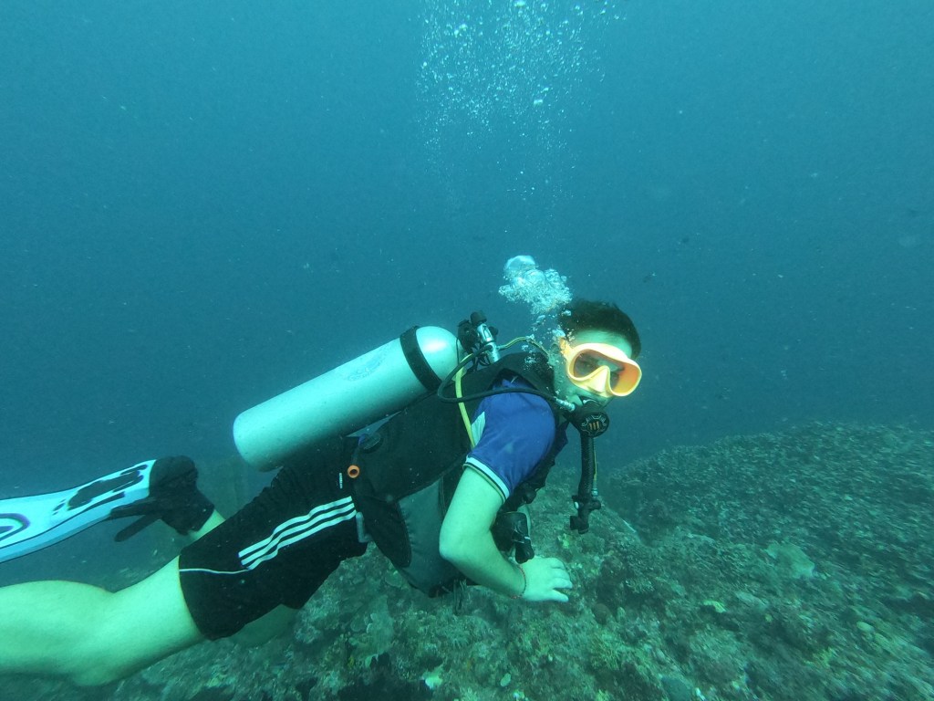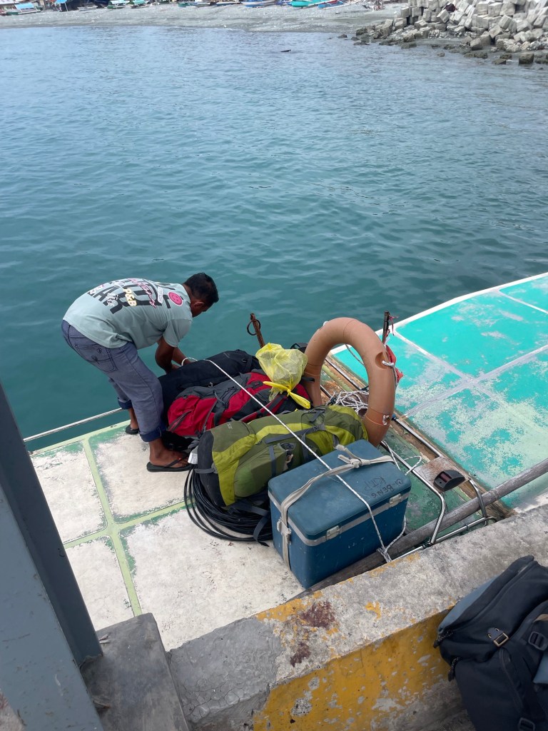 Da unsere Unterkünfte keine Tauchschulen vor Ort hatten, mussten wir per WhatsApp die Tauchgänge planen – was bei fehlendem WLAN und sehr schlechtem Empfang gar nicht so einfach ist. Es hat aber zweimal geklappt. Für den ersten Tauchtag wurden wir direkt beim Poyalisa abgeholt. Leider waren das die schlechtesten Tauchgänge, die wir bisher auf der Reise gemacht haben. Zuerst haben sie unsere Neoprenanzüge vergessen – was bei knapp 30 Grad Wassertemperatur zum Glück kein Problem darstellt. Die Sicht war aber an diesem Tag sehr schlecht, die Farben der Korallen kamen überhaupt nicht raus, und wir fanden, dass es kaum Fische gab. Allgemein war sehr wenig unter Wasser los, und wir waren ziemlich enttäuscht vom Tauchspot.