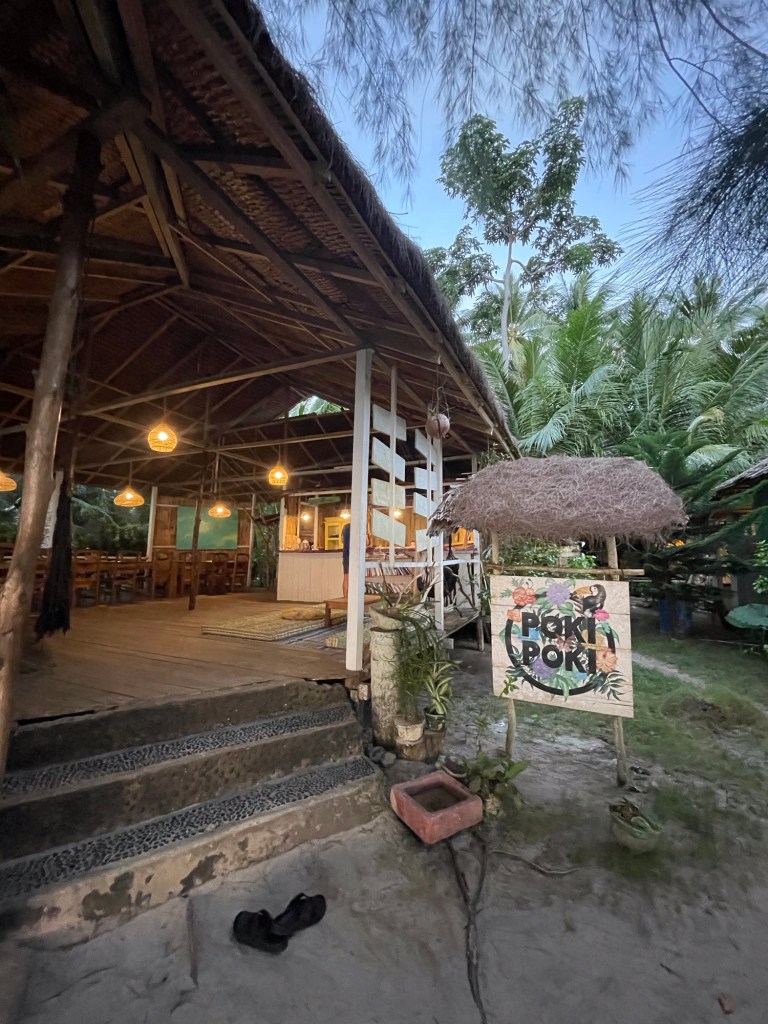 Die Bungalows befanden sich am Palmenstrand, und es wurde von einer Französin geführt. Diesen europäischen Einfluss konnten wir direkt spüren. Die Zimmer waren etwas liebevoller eingerichtet, das Klo hatte eine normale Spülung, und beim Essen wurde sogar ein Messer aufgedeckt – etwas, das wir seit Monaten nicht mehr benutzt haben. In Indonesien wird von Hand oder mit Gabel und Löffel gegessen.
