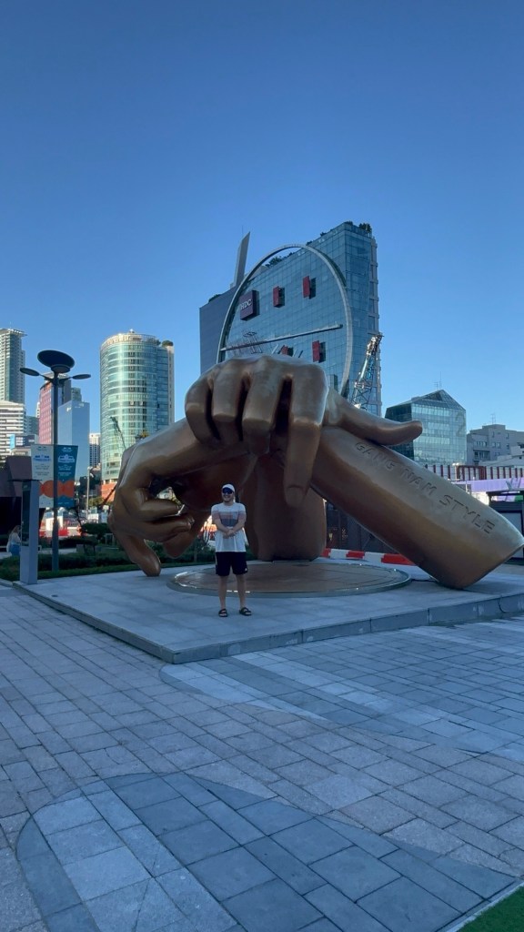 Nach dem Turm fuhren wir weiter in ein Viertel, das durch eines der ersten südkoreanischen Lieder in Europa internationale Bekanntheit erlangte. Es handelt sich um das Geschäfts- und Luxusviertel Gangnam – vielen bekannt durch den Song „Gangnam Style“ von PSY. Der Song überzeugt mit seinem einprägsamen Tanz und der ansteckenden Musik und war in den Jahren 2012 bis 2017 mit etwa 806 Millionen Aufrufen das meistgesehene Video auf YouTube. Im Viertel wurde dem Song sogar eine Statue gewidmet – der Hauptgrund unseres Besuchs dort.