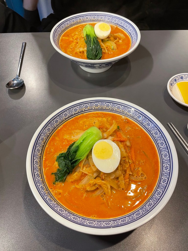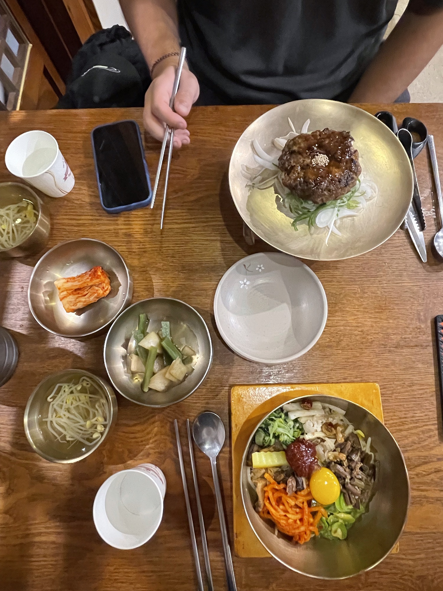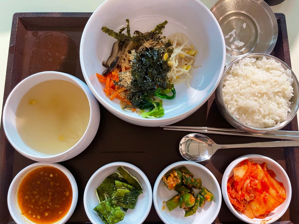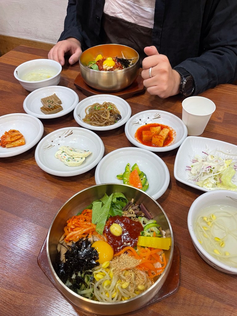 Das Essen in Südkorea ist sehr fleisch- und fischlastig und japanisch angehaucht. Das traditionelle Gericht, das wir am häufigsten gegessen haben, ist Bibimbap. Dabei wird eine Schüssel mit Reis serviert, die mit verschiedenen Gemüsesorten wie Wasserspinat, Karotten, Pilzen und typischerweise mit Rinder-Tartar und einem Eigelb getoppt wird. Dazu werden meistens eine kleine Brühe, das bekannte Kimchi und noch weitere fermentierte Gemüse serviert. Das gesamte Gericht lässt sich auch gut vegetarisch ohne Fleisch bestellen.