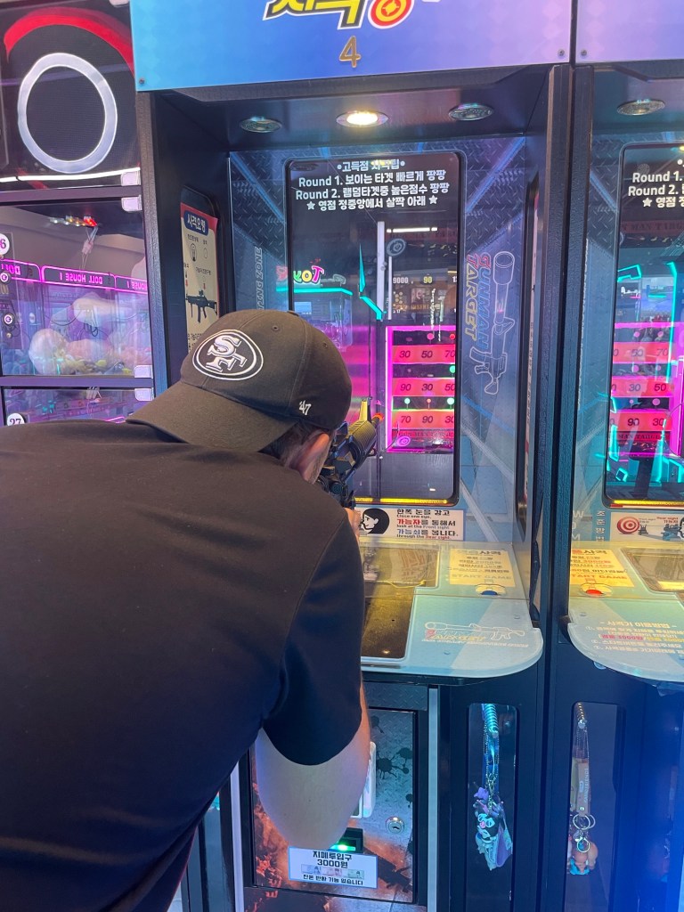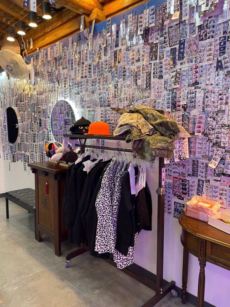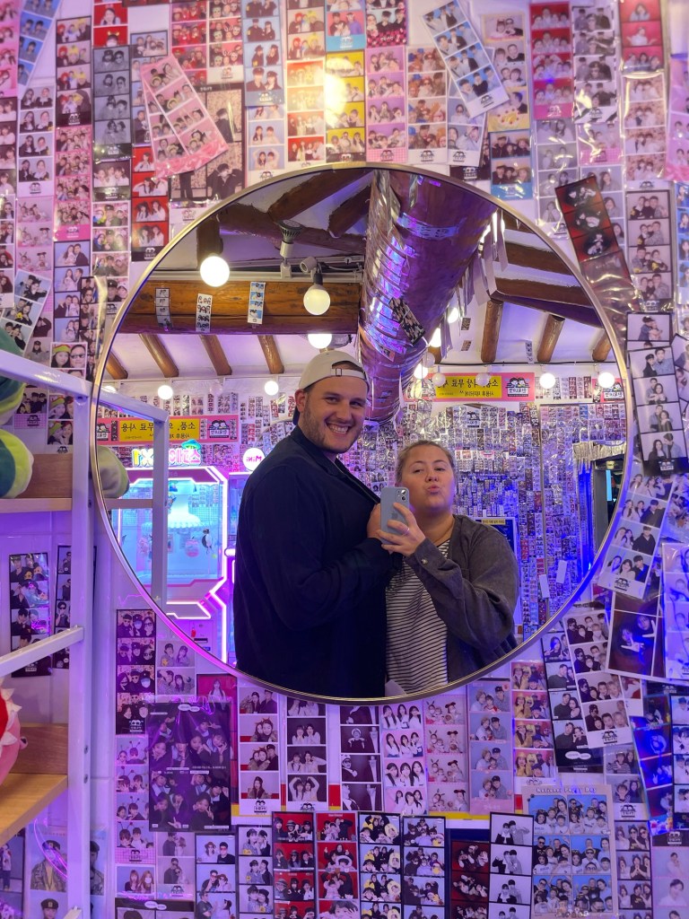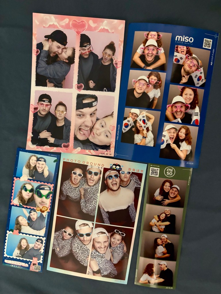 Wir beide hatten bereits ein paar Bilder im Kopf, wenn wir über Südkorea gesprochen haben. Neben den Ortschaften waren das die Fotoautomaten, Spielhallen, K-Pop und Gesichtspflege. Alle diese Punkte haben sich vor Ort wirklich bestätigt. An jeder Ecke lassen sich Fotoautomaten finden, bei denen Verkleidungen wie Sonnenbrillen, Hüte oder Oberteile sowie eine Stylingecke mit Lockenstab und Glätteisen für die Haare angeboten werden. Auch wir mussten immer wieder solch einen Automaten besuchen und haben verschiedene Verkleidungen ausprobiert und hatten grossen Spass dabei.