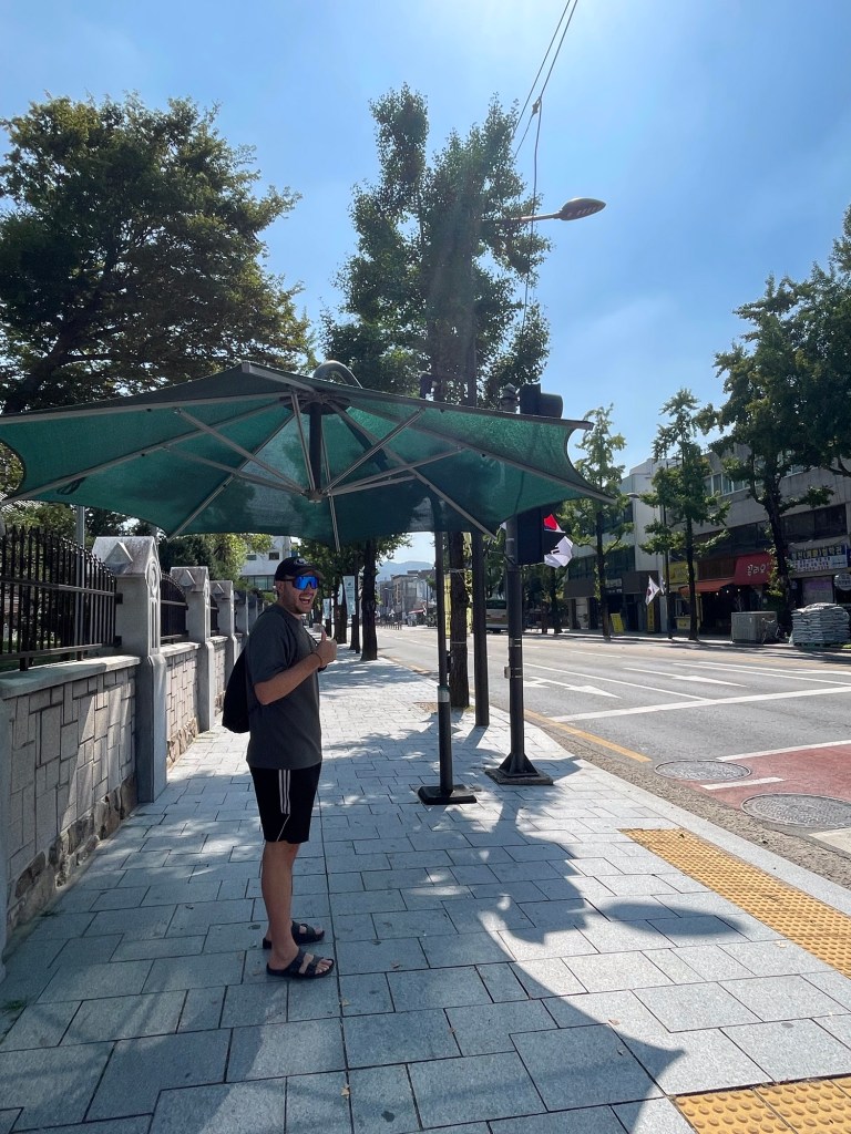 Wir haben die Südkoreaner als sehr höflich und freundliche Leute wahrgenommen. Sie haben uns bei Bedarf stets geholfen und waren sehr bemüht. In den meisten kleinen Läden oder Restaurants funktionierte die einfache Kommunikation auf Englisch, was es sehr angenehm gemacht hat. Südkoreaner wirkten auf uns wie sehr gepflegte Menschen, die grossen Wert auf ihr Äusseres legen. Die Mode, vor allem unter den Jungen, ist ausgefallen und auffällig. Haarwickler zum Beispiel sind ein Modetrend, den die Leute drin lassen, und so spazieren sie durch die Stadt. Auch in den Läden konnten wir die grossen Unterschiede zu unserer Mode sehen. Accessoires, die wir noch nie gesehen haben, wurden verkauft, und Kleidung, die direkt aus einem K-Pop-Video stammen könnte, wurde von Schaufensterpuppen präsentiert. Sicher ein Teil der Kultur, der genauso wie die Tempel eindrucksvoll war, zu sehen und kennenzulernen. Da Südkoreaner versuchen, die Sonne zu meiden, gab es bei den meisten Fussgängerstreifen Sonnenschirme, die Schatten spenden.