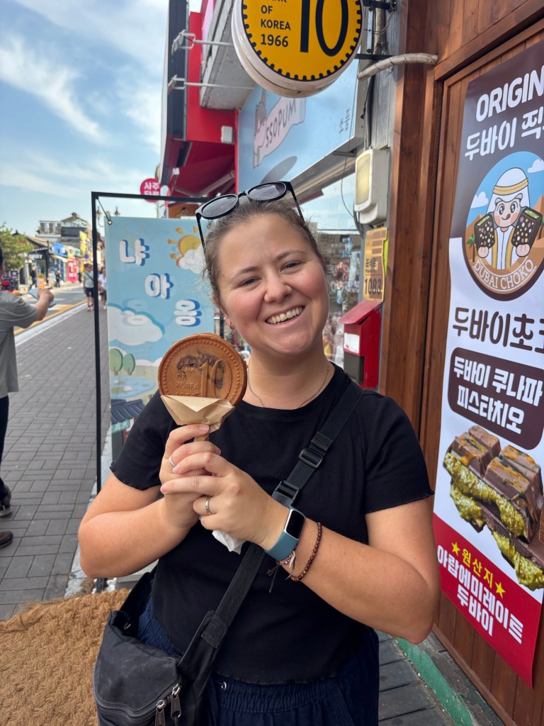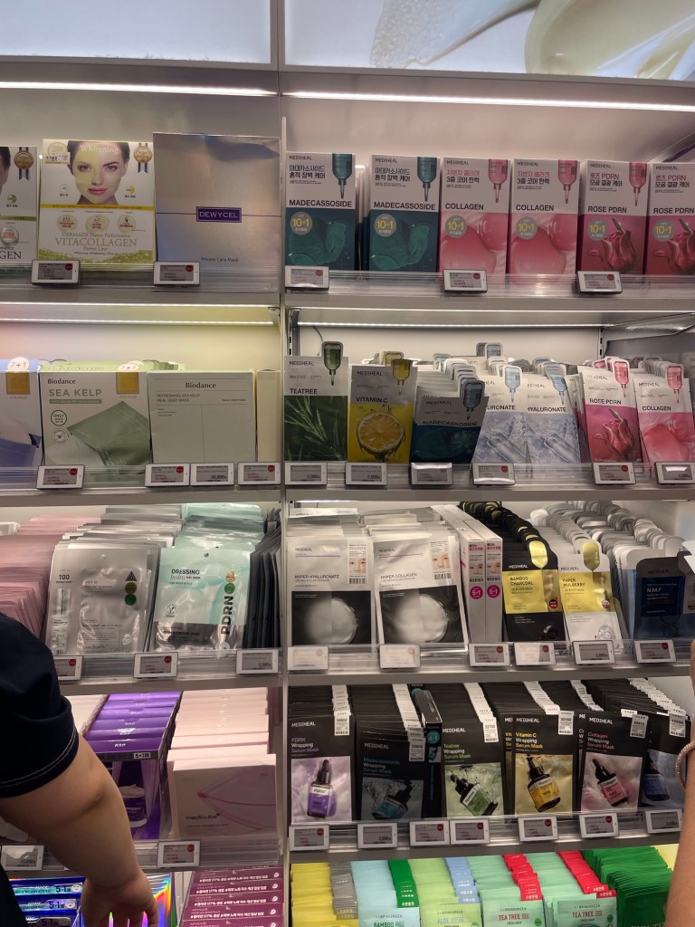 Ein weiterer Laden, der an jeder Ecke auftaucht, ist Olive Young. Wer sich etwas mit Kosmetik auskennt, weiss vielleicht, dass Südkorea sehr bekannt ist für seine Gesichtspflegeprodukte, auch bekannt unter dem Begriff K-Beauty. In Südkorea gilt makellose Haut als Schönheitsideal und es wird viel dafür gemacht, egal welches Geschlecht. Da Südkorea sehr viel in die Forschung und Entwicklung dieser Beauty-Produkte investiert, sind diese auch weltweit so bekannt. In Südkorea ist das Preis-Leistungs-Verhältnis für diese Produkte extrem gut, weshalb viele Touristen Unmengen dieser Produkte kaufen. Ein weiterer Vorteil ist, dass in Südkorea direkt im Laden der Pass angegeben werden kann, um dann am Flughafen die Mehrwertsteuer zurückzuholen. Für die kleinen Beträge, die wir in Südkorea für Einkäufe ausgegeben haben, hat sich das natürlich nicht gelohnt. Trotzdem haben auch wir ein paar Gesichtsmasken ausprobiert und Augenpads aus Versehen in jeweils 30er-Packungen gekauft, die uns sicher noch eine Weile auf unserer Reise begleiten werden.