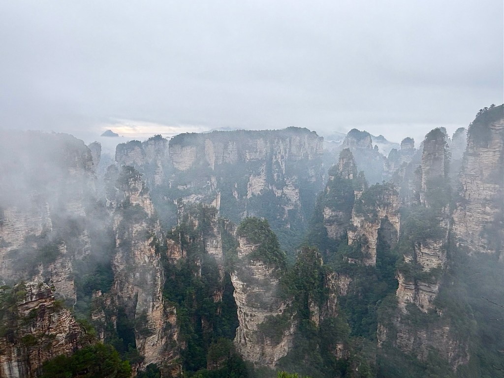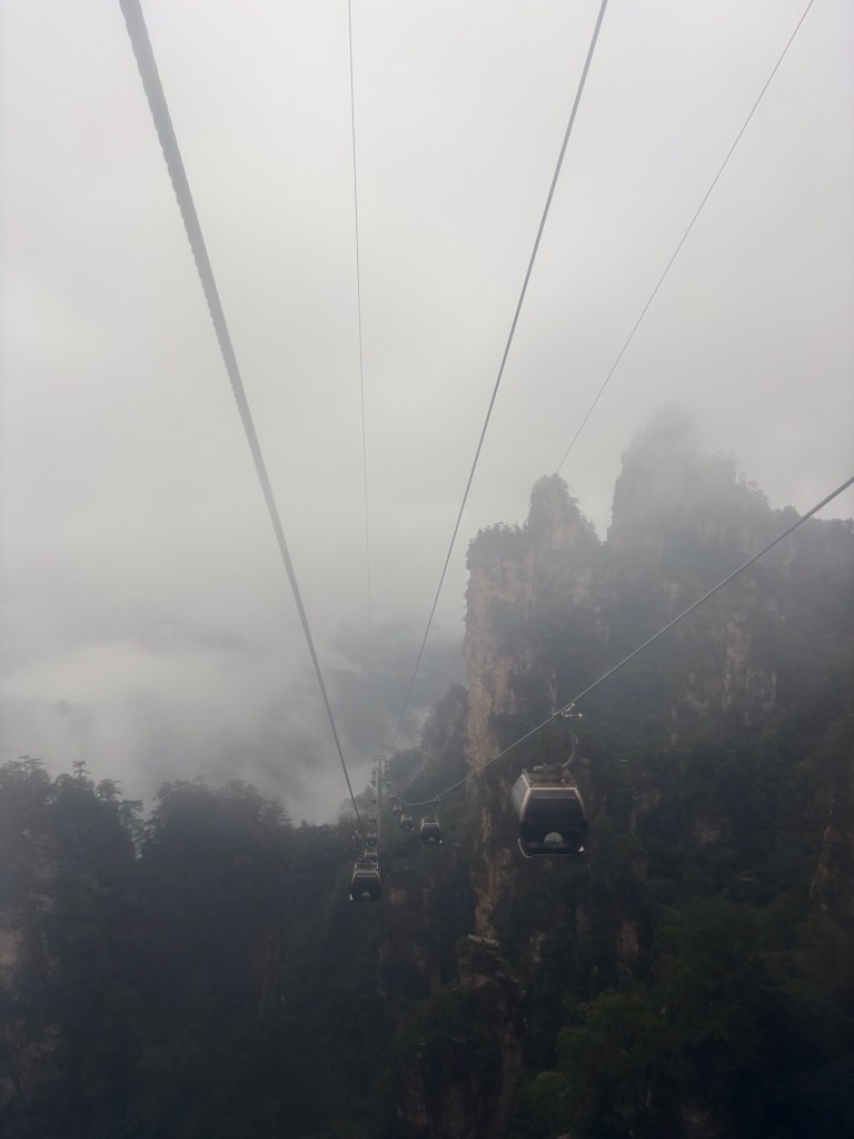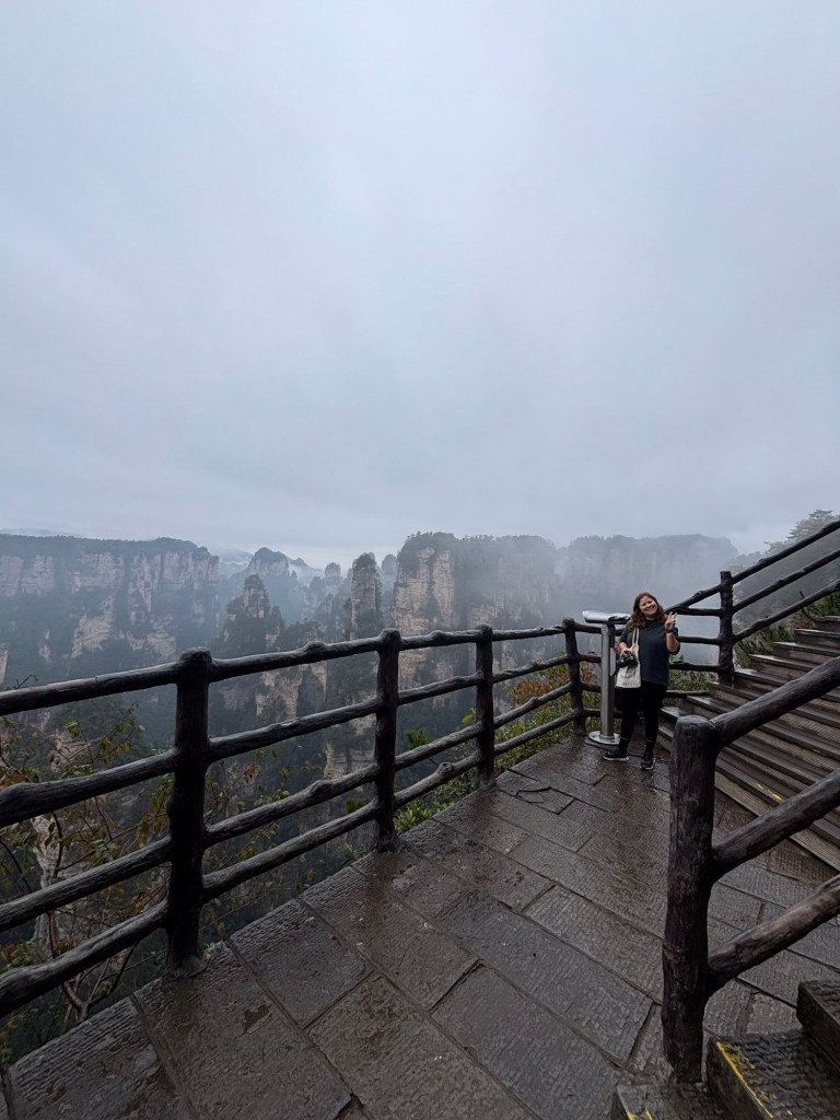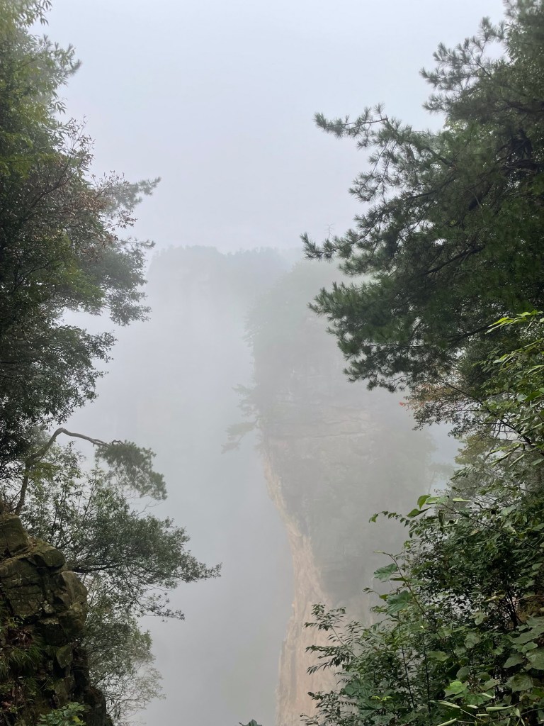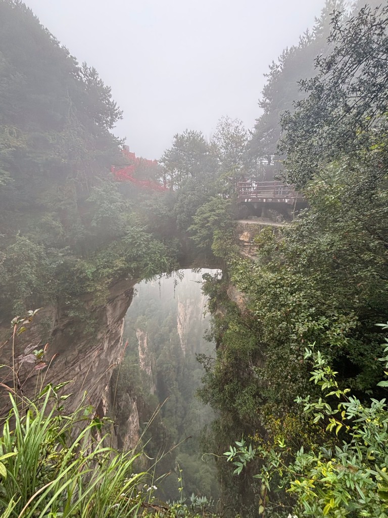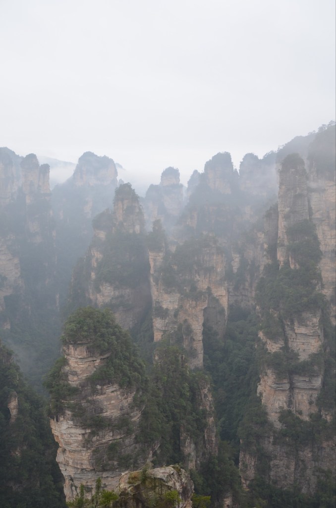 Oben angekommen wurden wir zwar von leichtem Nebel empfangen, aber es war noch etwas Sicht vorhanden. Zu Fuss ging es nun von einer Aussichtsplattform zur nächsten, doch die Sicht wurde immer schlechter. Trotzdem erhaschten wir einen ersten Blick auf die berühmten Halleluja-Berge aus dem Film Avatar. Dieser spielt auf dem Mond Pandora – das Rätsel ist also gelöst. 😉
