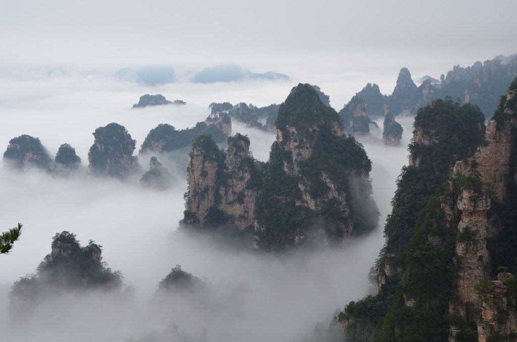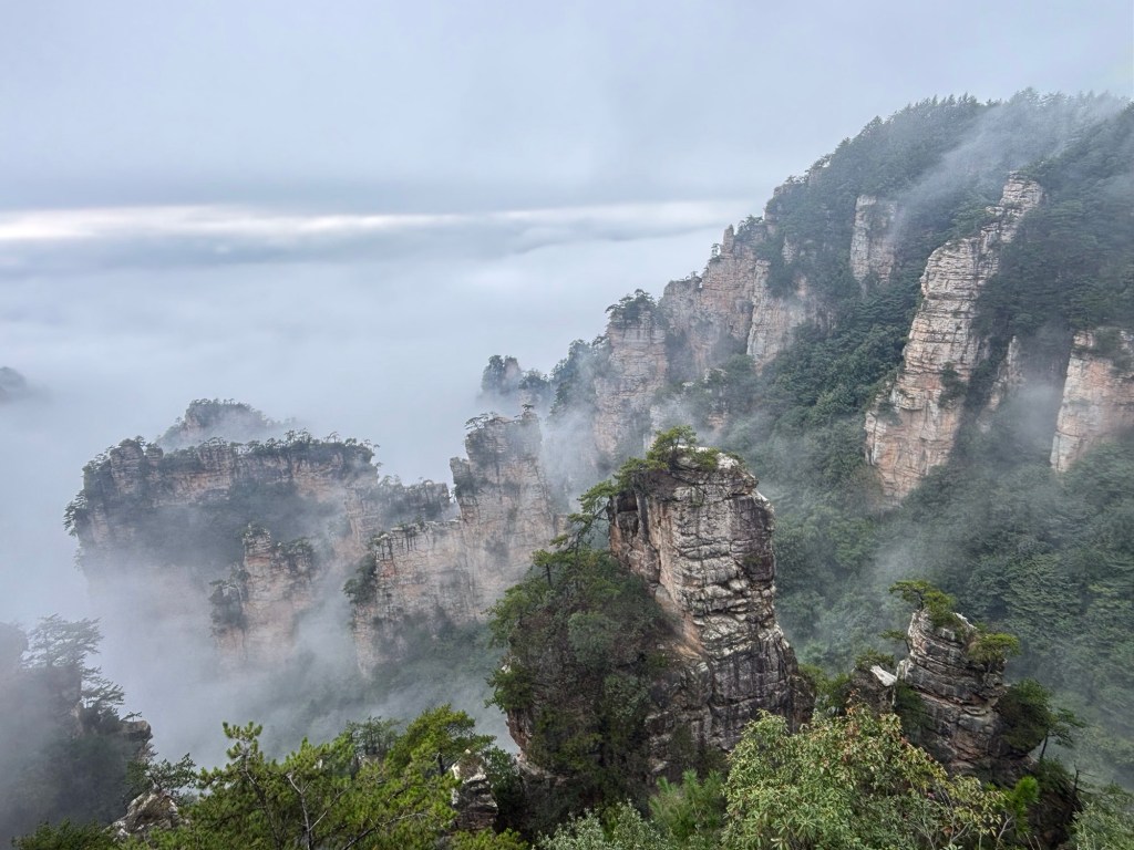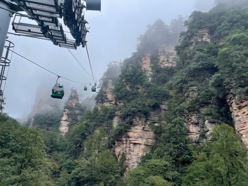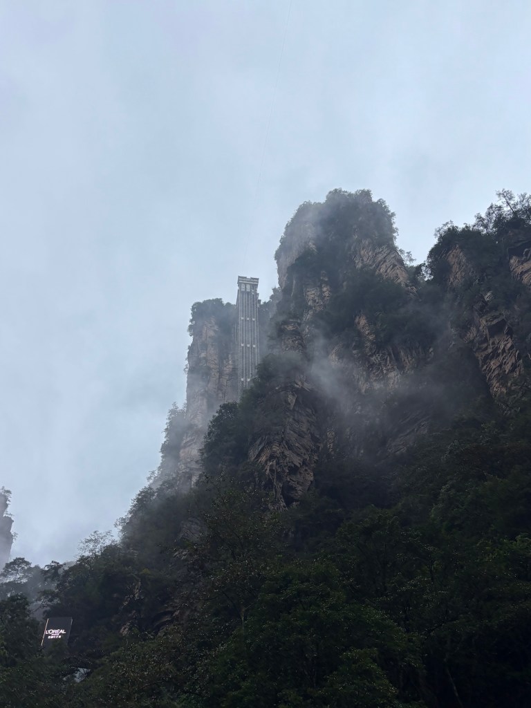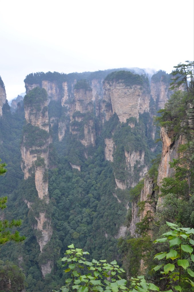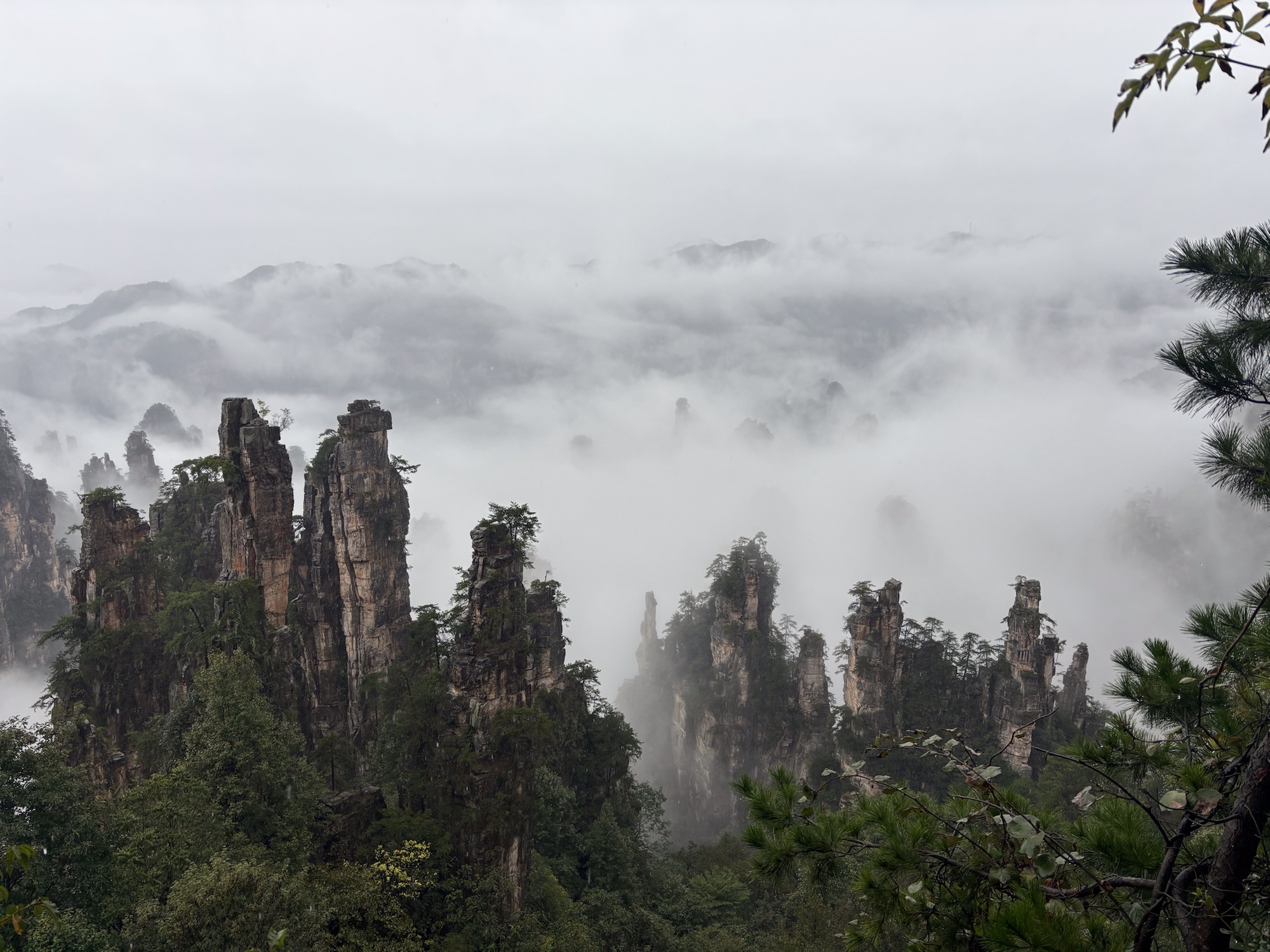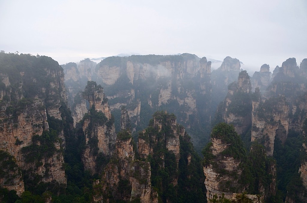 Oben angekommen wurden wir zwar von leichtem Nebel empfangen, aber es war noch etwas Sicht vorhanden. Zu Fuss ging es nun von einer Aussichtsplattform zur nächsten, doch die Sicht wurde immer schlechter. Trotzdem erhaschten wir einen ersten Blick auf die berühmten Halleluja-Berge aus dem Film Avatar. Dieser spielt auf dem Mond Pandora – das Rätsel ist also gelöst. 😉