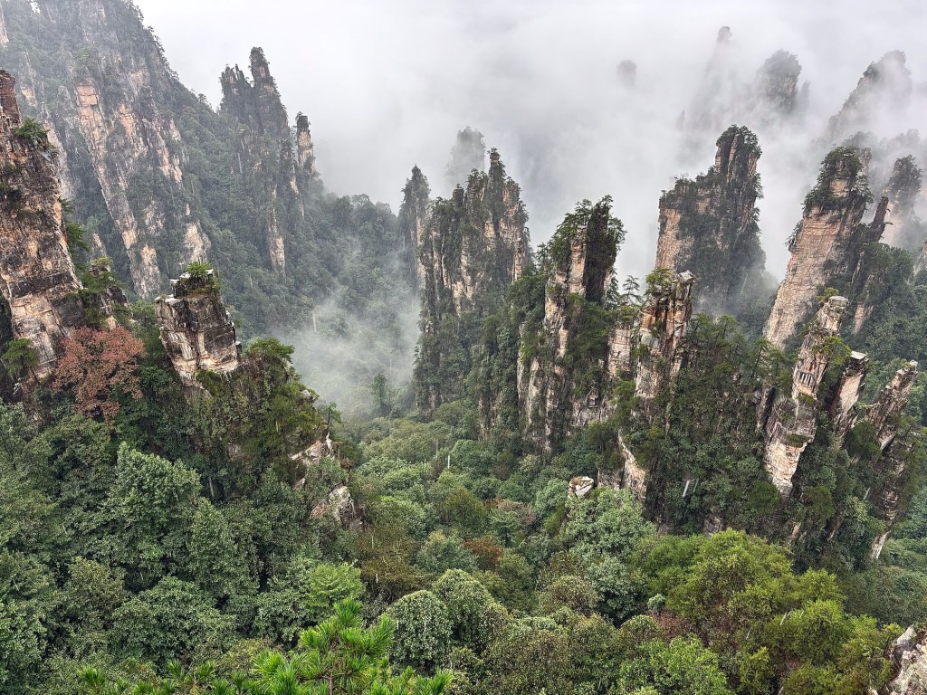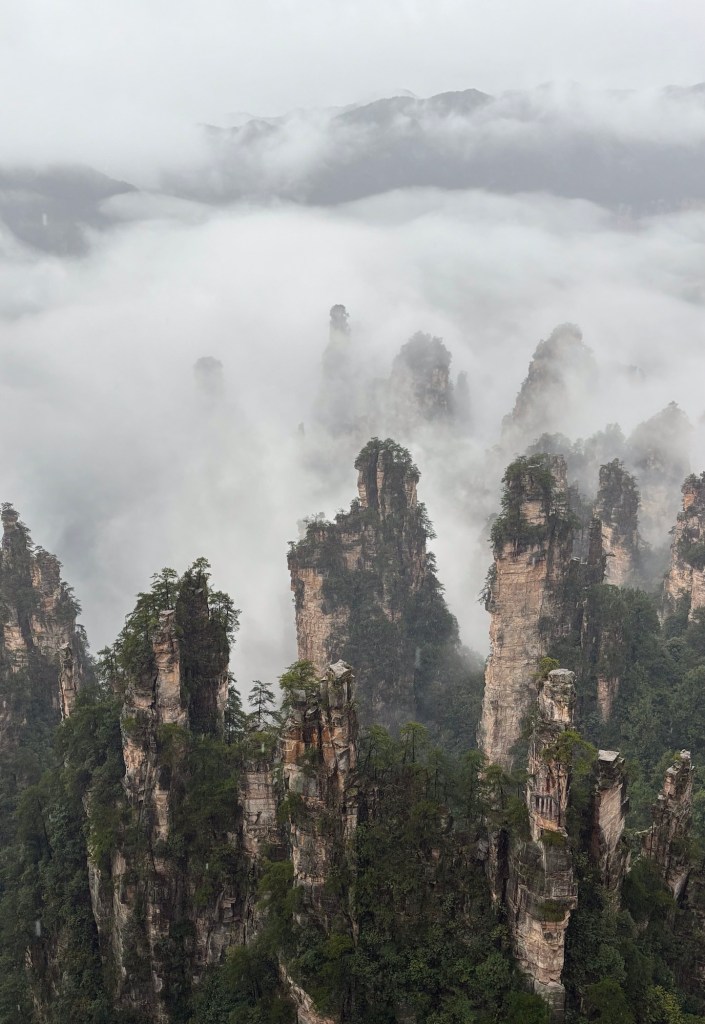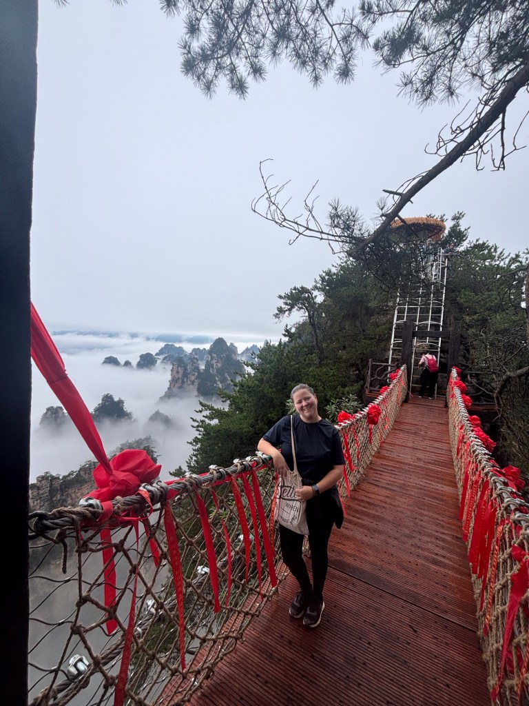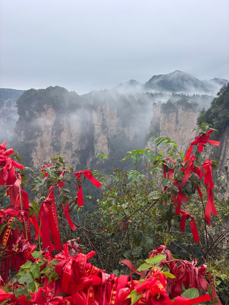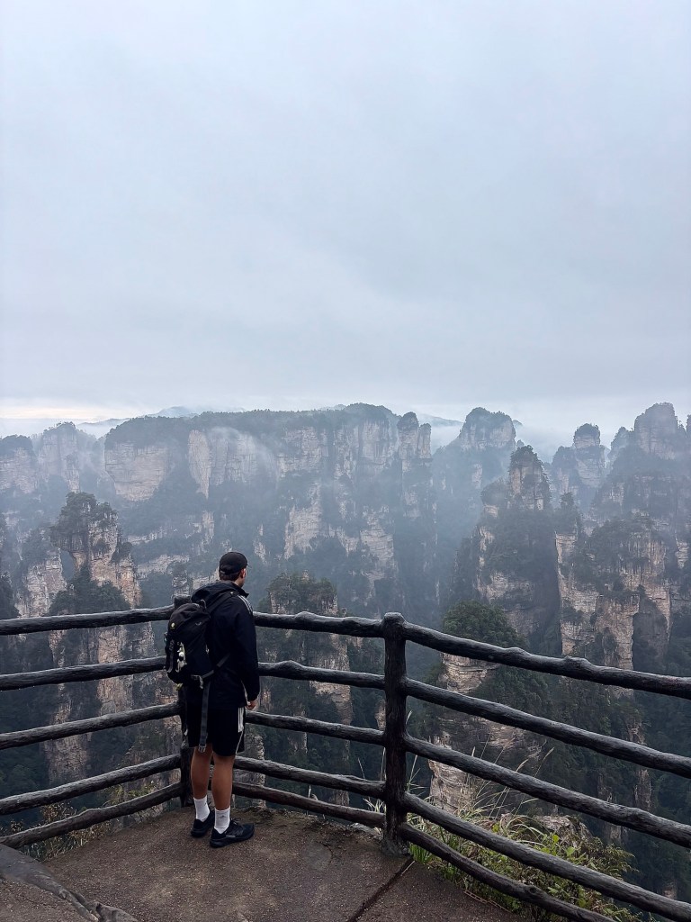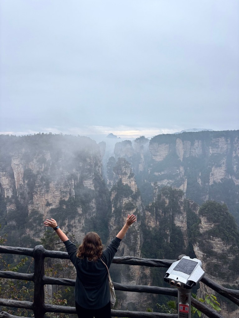 Oben angekommen wurden wir zwar von leichtem Nebel empfangen, aber es war noch etwas Sicht vorhanden. Zu Fuss ging es nun von einer Aussichtsplattform zur nächsten, doch die Sicht wurde immer schlechter. Trotzdem erhaschten wir einen ersten Blick auf die berühmten Halleluja-Berge aus dem Film Avatar. Dieser spielt auf dem Mond Pandora – das Rätsel ist also gelöst. 😉
