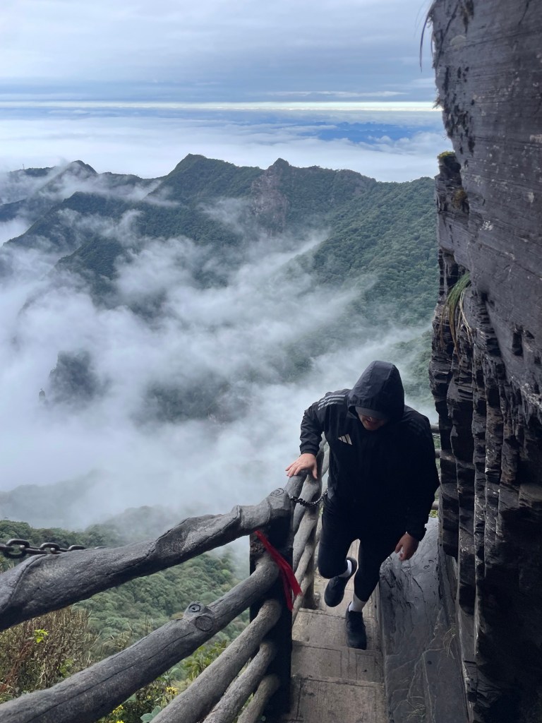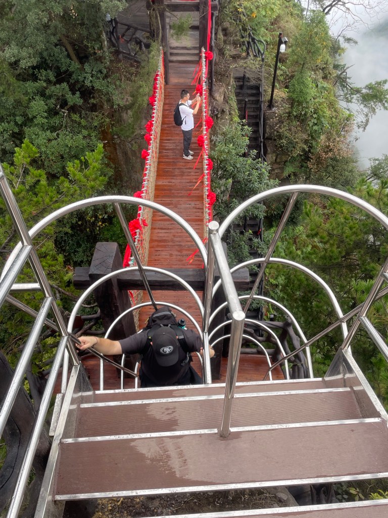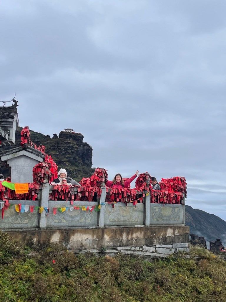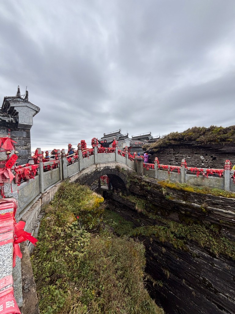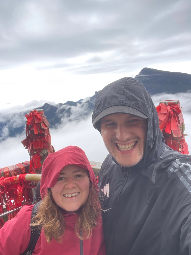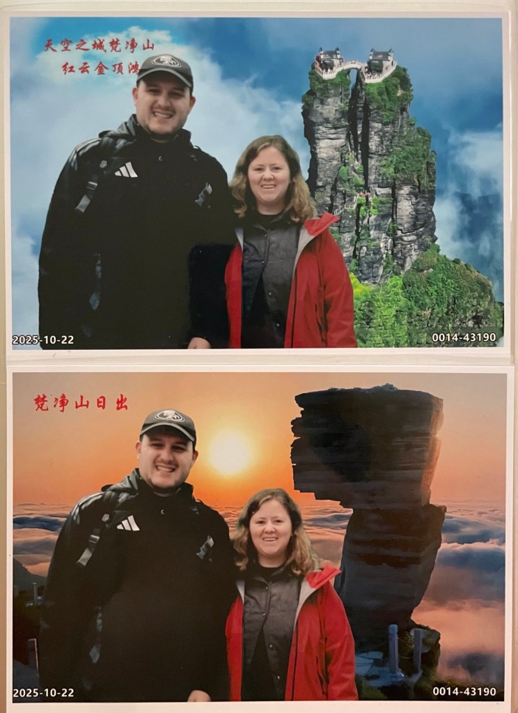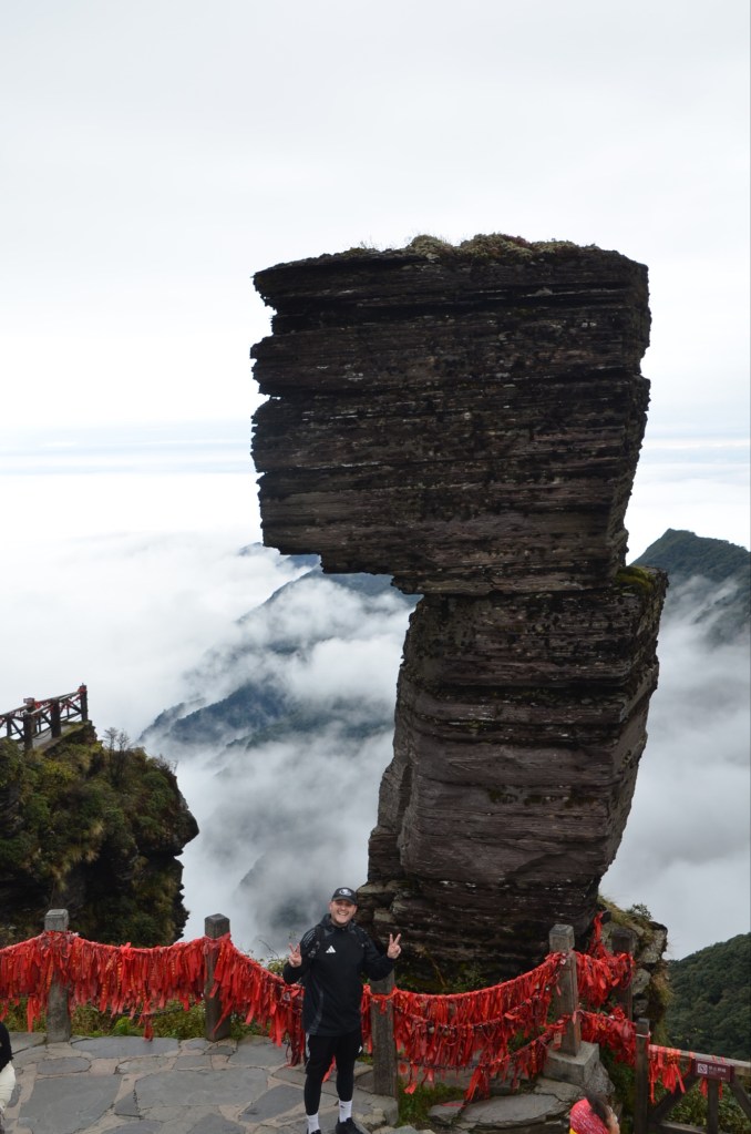 Oben angekommen, befinden sich auf den beiden Spitzen zwei kleine Tempel, die durch eine Steinbrücke miteinander verbunden sind. Einmal mehr mussten wir jedoch feststellen, dass nicht alles so ist, wie es auf Social Media dargestellt wird. Das klassische, bekannte Bild des Fanjing Shan Berges ist eine Aufnahme mit einer Drohne, und als Mensch kann man diese Perspektive so nicht selbst erleben – was doch enttäuschend war. Wie in vielen anderen Nationalparks in China werden Fotos gemacht, die später gekauft werden können. Obwohl unser Bild nicht wirklich gelungen ist, fanden wir es irgendwie lustig, und es war wirklich sehr günstig – also haben wir das Bild mit der falschem Motiv auch gekauft. Die gesamte Aussicht vom Gipfel aus war jedoch sehr beeindruckend, weshalb sich der Aufstieg dorthin auf jeden Fall gelohnt hat.
