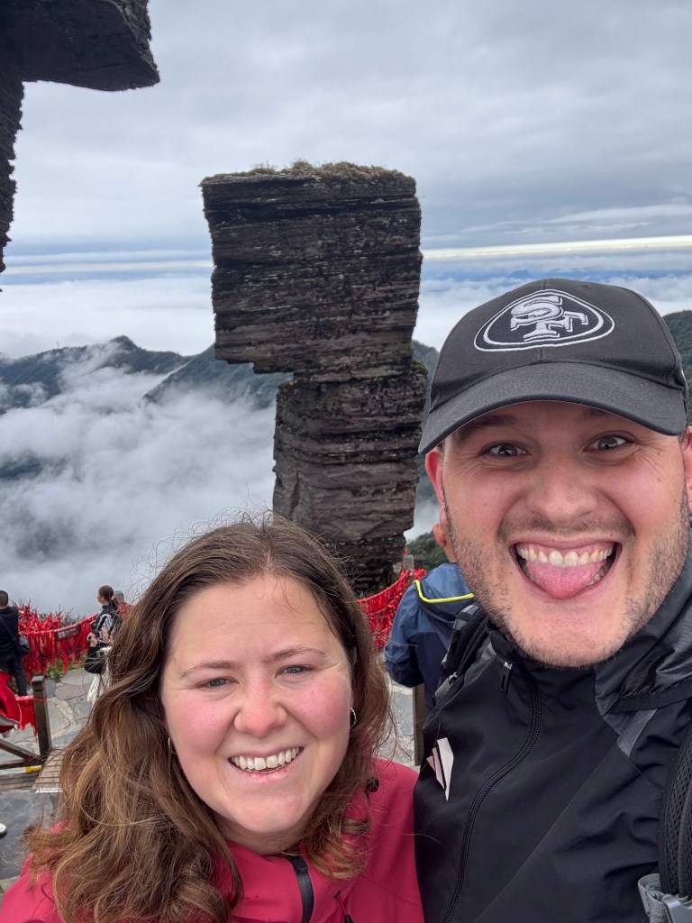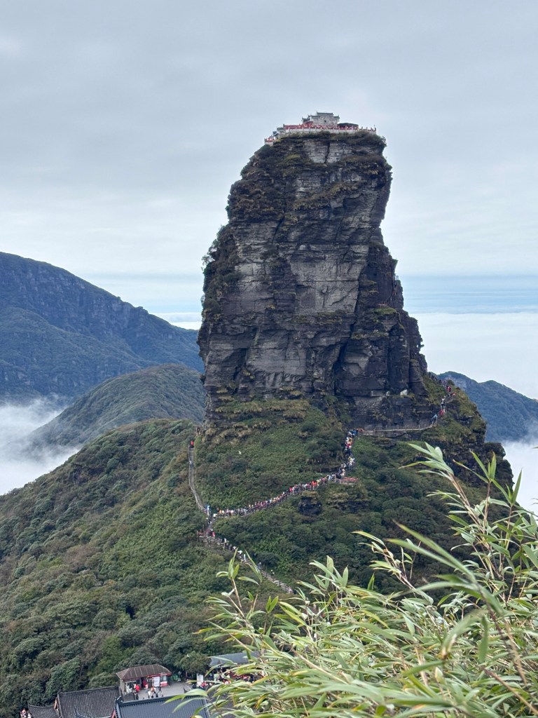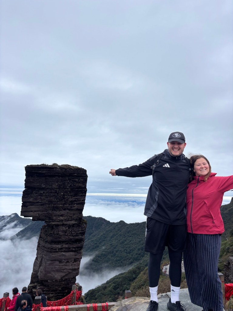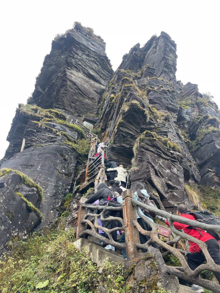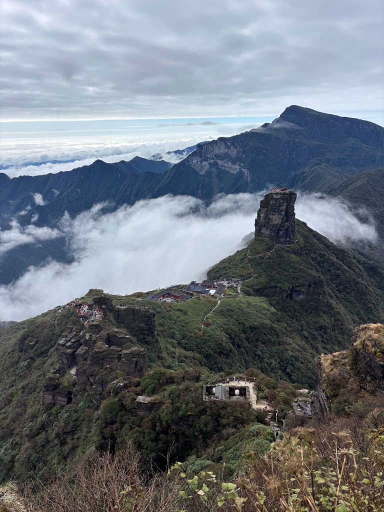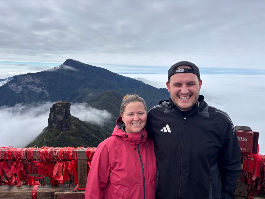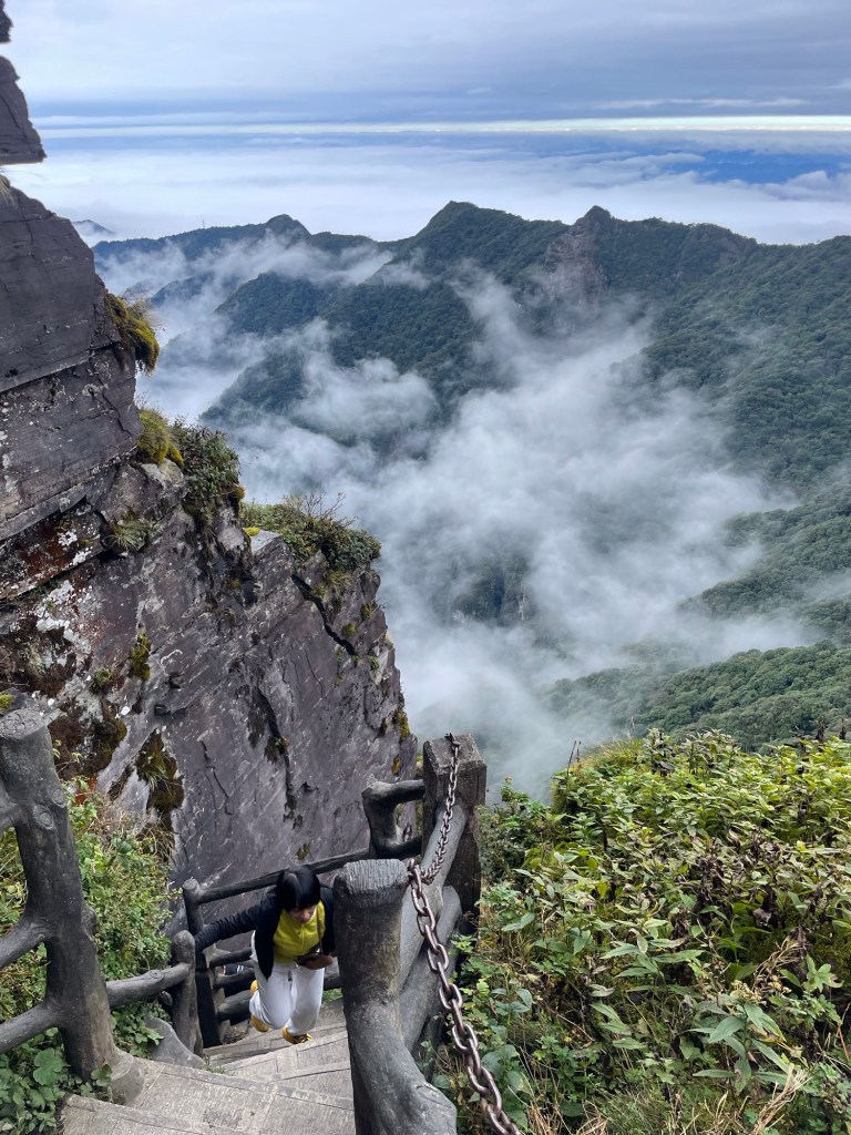 Oben angekommen, befinden sich auf den beiden Spitzen zwei kleine Tempel, die durch eine Steinbrücke miteinander verbunden sind. Einmal mehr mussten wir jedoch feststellen, dass nicht alles so ist, wie es auf Social Media dargestellt wird. Das klassische, bekannte Bild des Fanjing Shan Berges ist eine Aufnahme mit einer Drohne, und als Mensch kann man diese Perspektive so nicht selbst erleben – was doch enttäuschend war. Wie in vielen anderen Nationalparks in China werden Fotos gemacht, die später gekauft werden können. Obwohl unser Bild nicht wirklich gelungen ist, fanden wir es irgendwie lustig, und es war wirklich sehr günstig – also haben wir das Bild mit der falschem Motiv auch gekauft. Die gesamte Aussicht vom Gipfel aus war jedoch sehr beeindruckend, weshalb sich der Aufstieg dorthin auf jeden Fall gelohnt hat.