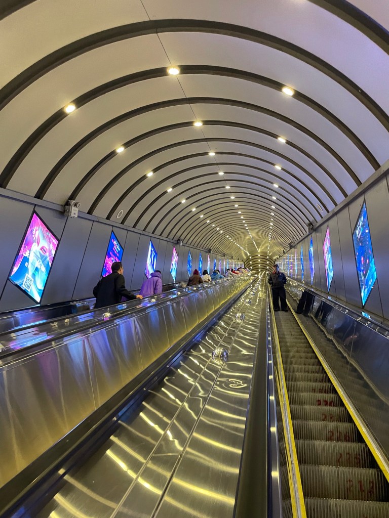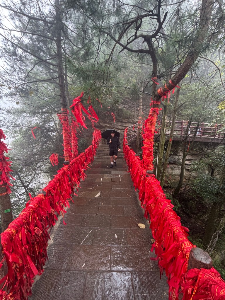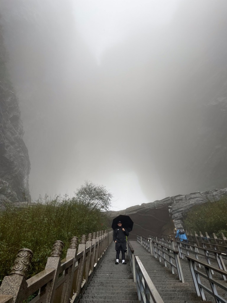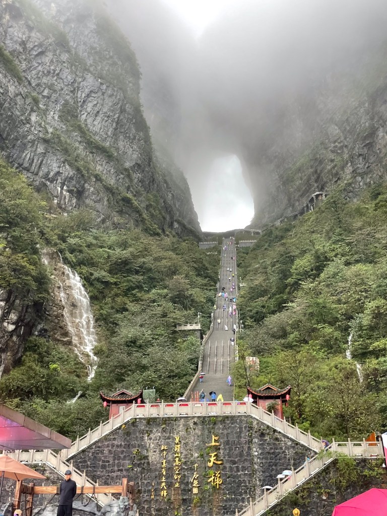 Eigentlich kann man ab der Gondelstation einen Rundweg laufen, und erst dann geht es mit der Rolltreppe weiter. Wir haben jedoch auf den gesamten Rundweg verzichtet und sind nur bis zum Glasbodenweg gegangen, der bei diesem Wetter natürlich keine Aussicht bot. Für Philippe mit leichter Höhenangst war das vielleicht gar nicht so schlecht. Nach dem Glasbodenweg sind wir direkt zur Rolltreppe weitergegangen, die uns über einen langen Tunnel nach unten zum berühmten Loch im Tianmen Mountain führte.