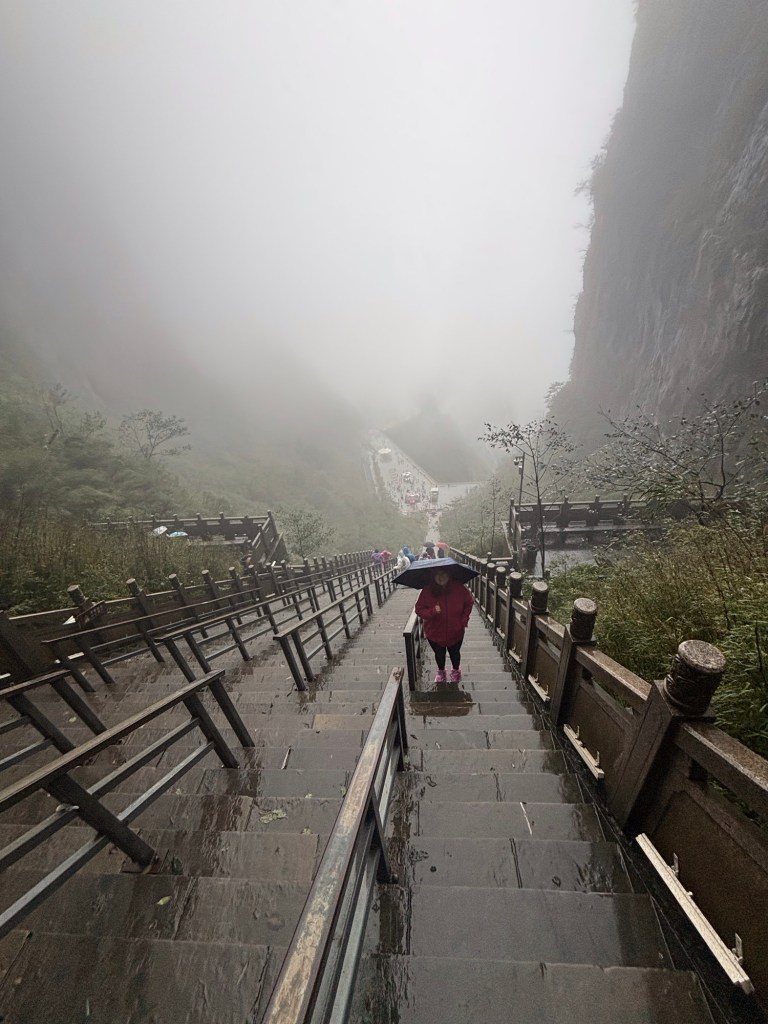 Dort hatten wir die Wahl, mit einer weiteren Rolltreppe nach unten zu fahren oder über eine lange Treppe den Weg zu Fuss zurückzulegen. Trotz des schlechten Wetters haben wir uns entschlossen, die Treppe zu nehmen und konnten immer wieder durch den Nebel hindurch erahnen, was sich rund um uns abspielte.