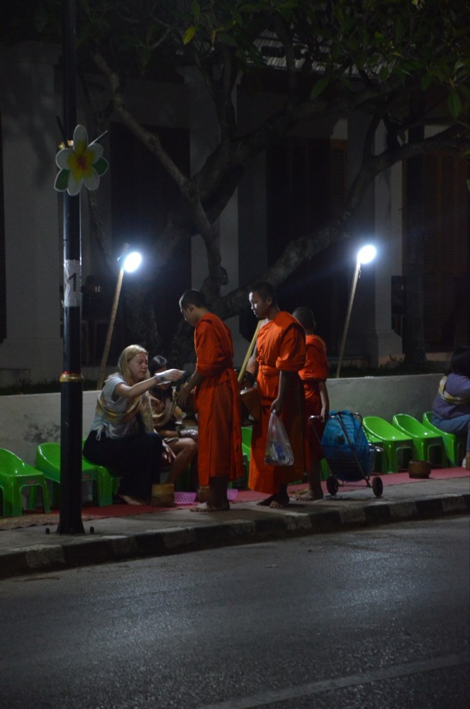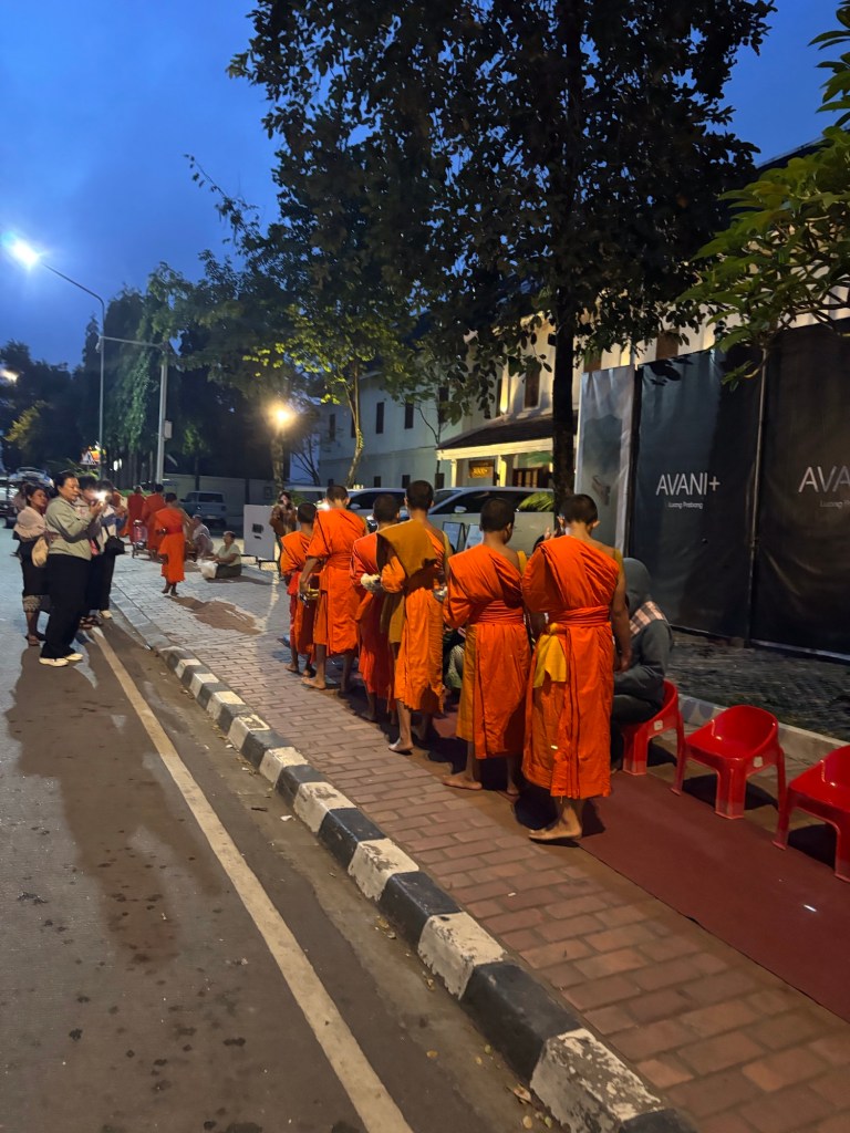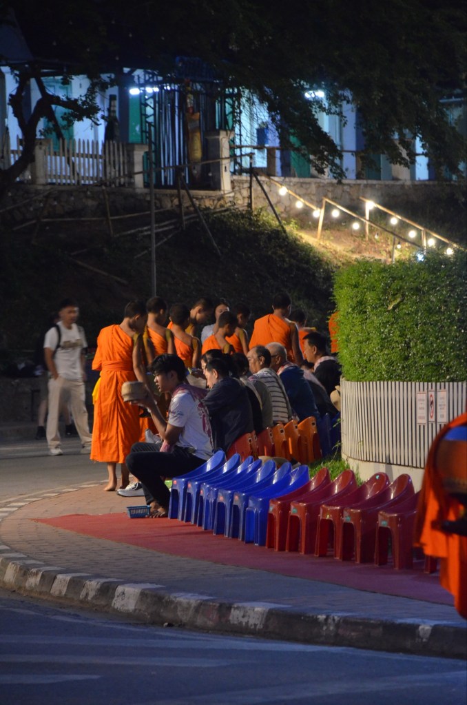 Am frühen Morgen findet jeweils der Almosengang der Mönche statt. Dabei laufen sie bei Sonnenaufgang durch die Strassen und erhalten von den Menschen kleine Spenden, meist in Form von Reis. Laos gehört dem Theravada-Buddhismus an, bei dem Mönche weder kochen noch Geld besitzen dürfen. Sie leben ausschliesslich von dem, was ihnen gespendet wird. Ob dies in Luang Prabang noch strikt eingehalten wird, wissen wir nicht – aber der Brauch am frühen Morgen findet weiterhin täglich statt.