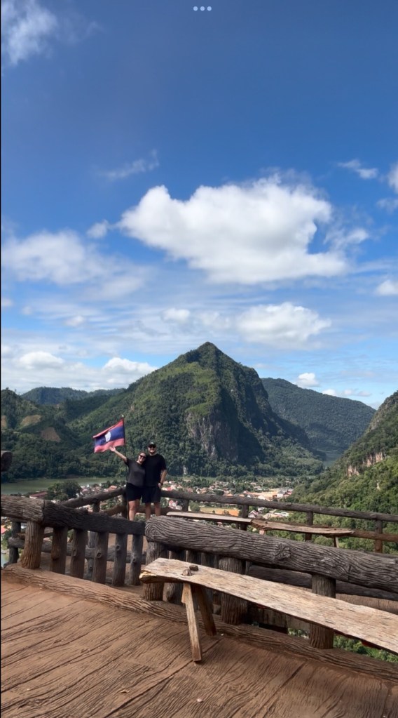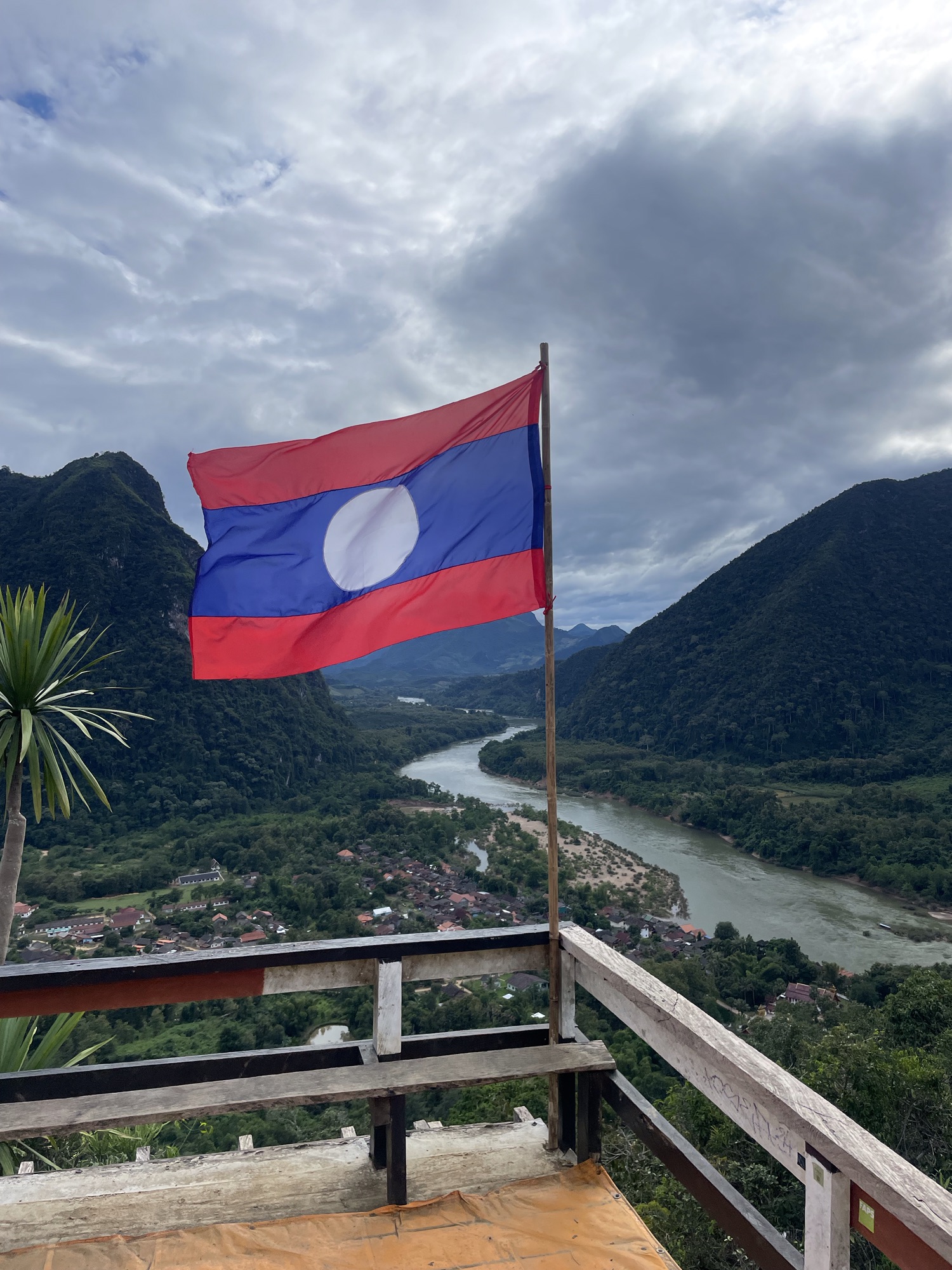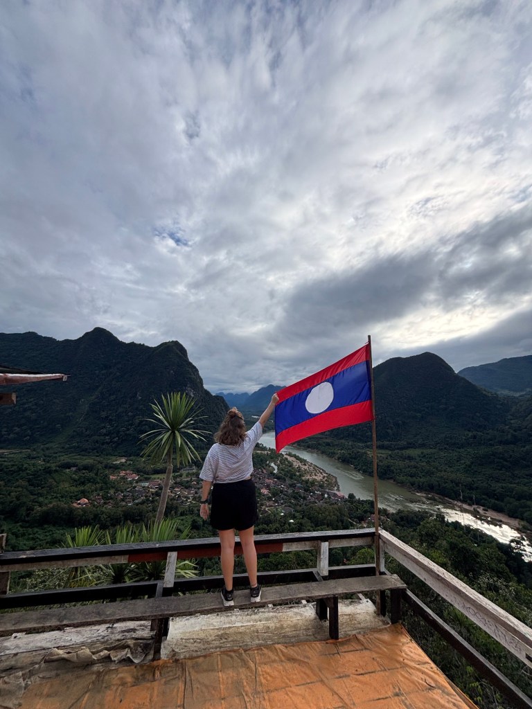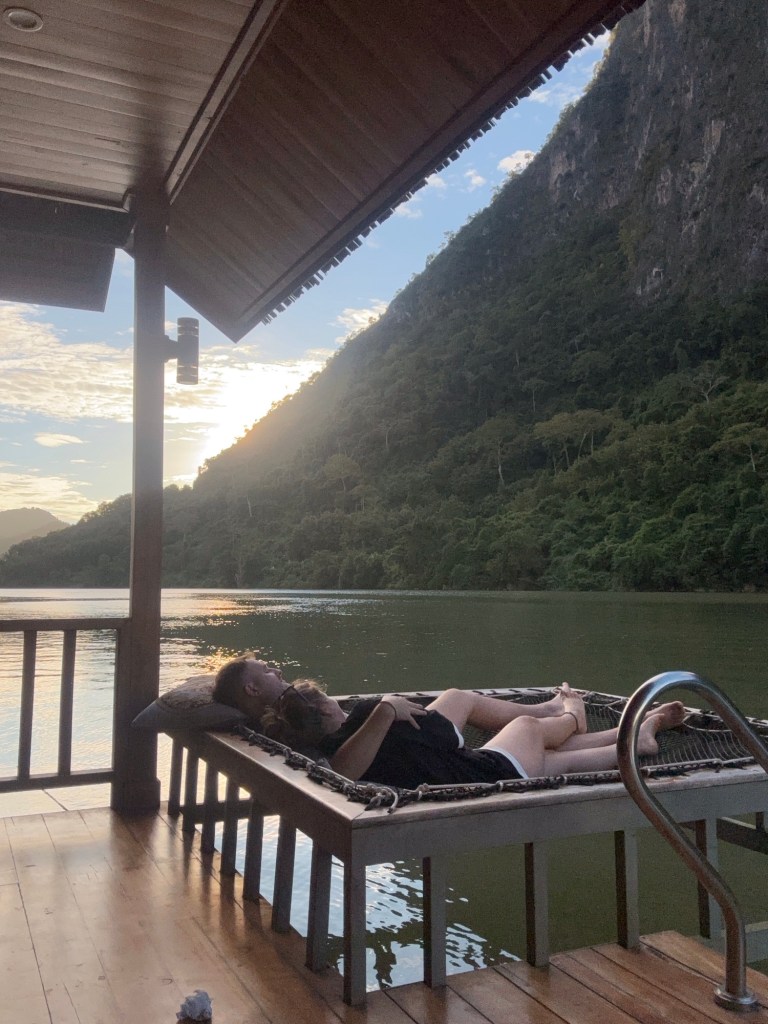 Mit dem Boot ging es anschliessend wieder flussabwärts zurück nach Nong Khiaw. Dort hatten wir noch einmal die gleiche Unterkunft für eine Nacht gebucht. Da wir das grosse Gepäck im Hotel lassen konnten, haben wir den Aussichtspunkt über Nong Khiaw direkt nach der Bootfahrt besucht, bevor wir zurück in unsere schwimmende Hütte gingen und dort den Rest des Tages ausklingen liessen.