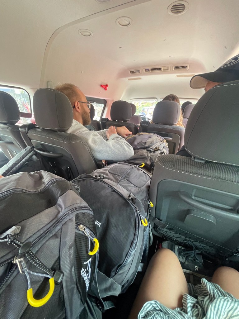 Mit einem vollgestopften Minivan ging es für uns weiter zum nächsten, etwas nördlicher gelegenen Stopp: Nong Khiaw. Als wir einstiegen, war im Shuttle noch genügend Platz und der Fahrer hatte das ganze Gepäck auf die hinterste Sitzreihe geworfen. Wir freuten uns noch, dass der Van wohl nicht voll ausgebucht war und so Platz für das Gepäck blieb. Doch wir lagen falsch. Die restlichen Plätze wurden noch vergeben und das Gepäck musste irgendwie im Gang verstaut werden.