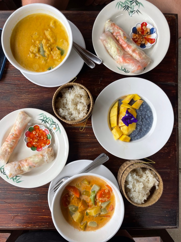 Wir konnten beide unser Hauptgericht selber wählen. Für Philippe gab es ein Kartoffelcurry und ich habe mich für ein Gemüse-Suzi entschieden, was sich jedoch als sehr ähnlich zu einem Curry herausstellte, nur mit anderem Gemüse. Als Vorspeise haben wir frische Frühlingsrollen – auch bekannt als Sommerrollen – selbst gerollt und das Menü mit einem klassischen Mango Sticky Rice abgerundet. Das Kochen der einzelnen Gerichte dauerte nicht allzu lange und wir hatten viel Spass dabei. Das Resultat sprach für sich und wir haben uns fest vorgenommen, die Rezepte zu Hause erneut auszuprobieren.