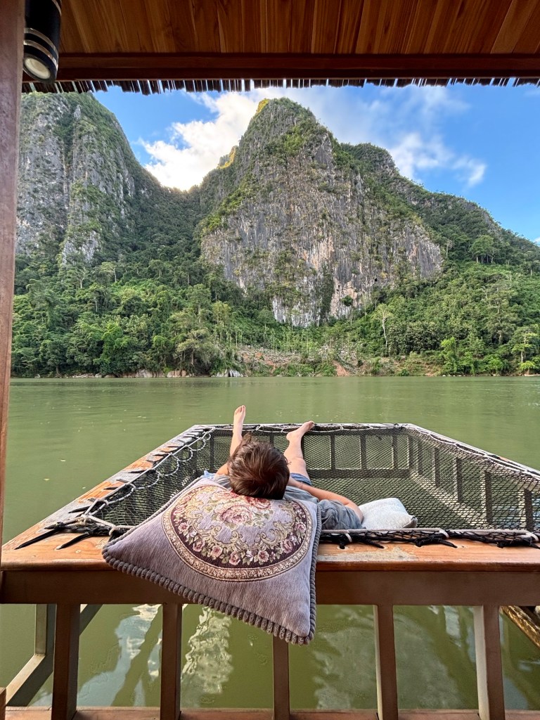 Es ist uns immer wieder ein Rätsel, weshalb in diesen Vans nie Platz fürs Gepäck eingeplant wird – bei unserem konnten wir es nicht einmal aufs Dach binden. Eingepfercht ging es für fünf Stunden über eine Strasse, die eher einer Schlaglochpiste glich. Gut durchgeschüttelt kamen wir schliesslich in Nong Khiaw an.