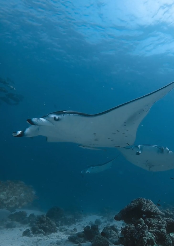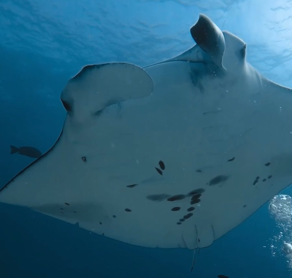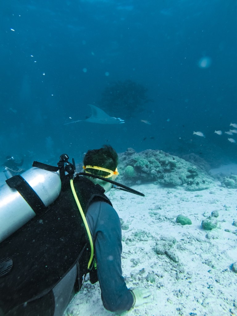 Der erste Spot war eine Putzstation für Mantarochen. Das bedeutet, dass sich an diesem Ort normalerweise mehrere Mantas aufhalten. Wir wurden nicht enttäuscht und konnten den Mantarochen gemütlich dabei zusehen, wie sie vor Ort ihre Kreise zogen. Wer unseren Beitrag über Raja Ampat kennt, weiss mittlerweile, dass wir Mantas besonders mögen. Auch beim dritten Mal Tauchen mit diesen Tieren war es wieder unglaublich faszinierend: Wie elegant sie durchs Wasser gleiten, sich teilweise spielerisch drehen oder von den Luftblasen der Tauchflaschen angezogen werden und dann direkt über einem hinwegschwimmen, sodass es für einen kurzen Moment dunkel wird – einfach beeindruckend.