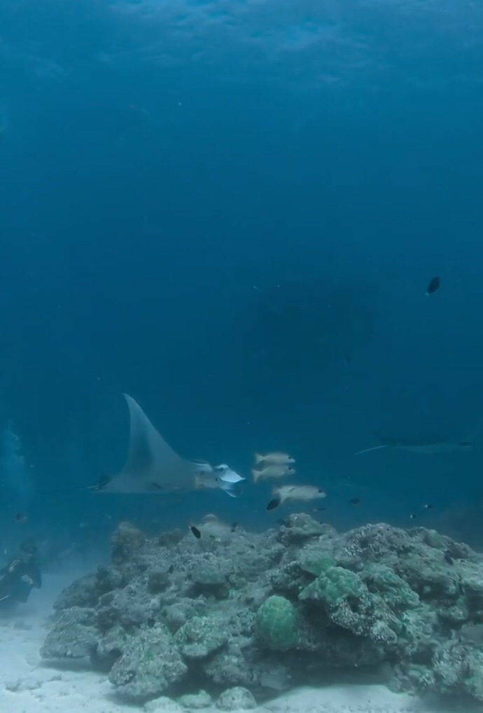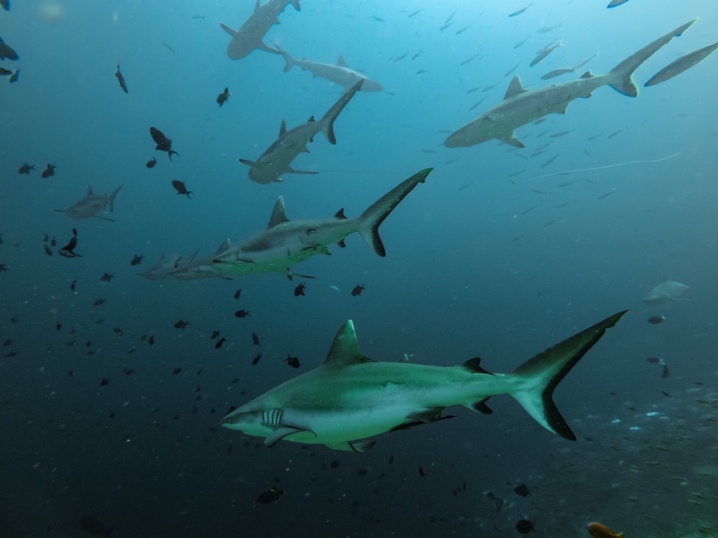 Der zweite Tauchgang war jedoch nicht weniger spektakulär. Dieser Spot wird „Balkon“ genannt, da sich der gesamte Tauchgang grösstenteils an einer Stelle abspielt. Wir konnten uns an den Felsen festhalten und den Haien beim Herumschwimmen zusehen. Es waren bestimmt um die 15 Haie, und im Hintergrund konnten wir sogar gepunktete Adlerrochen beobachten. Die Haie waren zwar etwas kleiner als die Tigerhaie auf Fuvahmulah, durch ihre Anzahl jedoch nicht weniger beeindruckend.