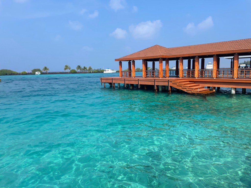 Der internationale Flughafen der Malediven liegt auf einer eigenen Insel, die durch eine Brücke mit der Stadt verbunden ist. Direkt beim Flughafen befindet sich auch der Hafen. Die Lage am türkisfarbenen Wasser ist wunderschön.